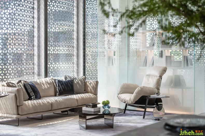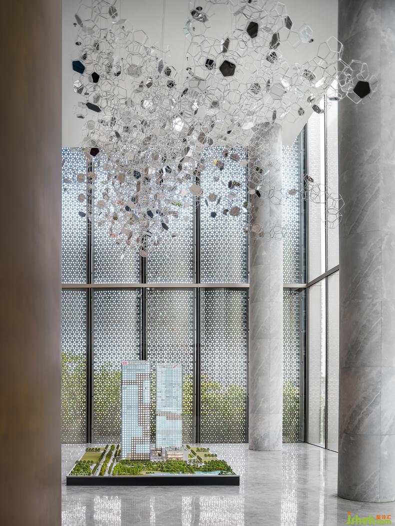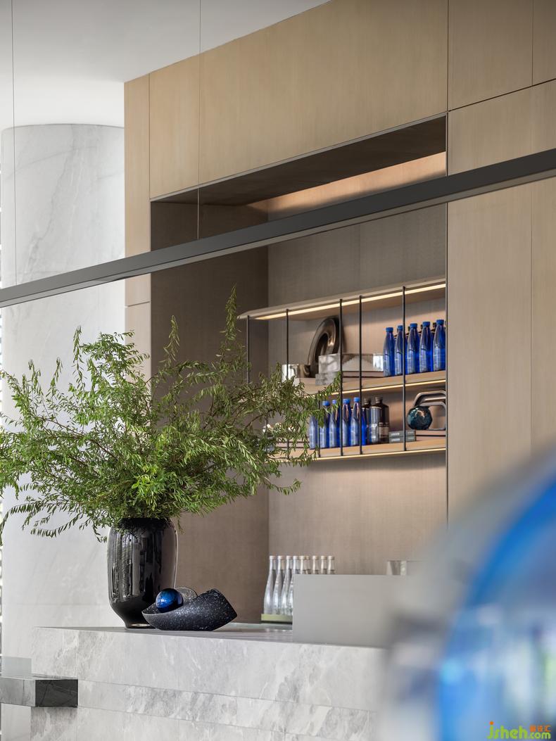 将自然写进生活,一切为提前上演未来生活而服务。水吧区的艺术装置品《破·晓》将现代与未来相连结,静谧的蓝宛如冲破时间缝隙的光,初始熹微,继而透亮。色彩运用干净利落,空间氛围在和谐中体现统一。