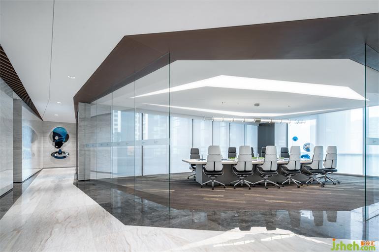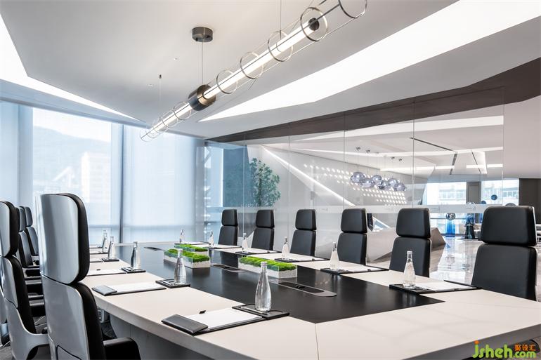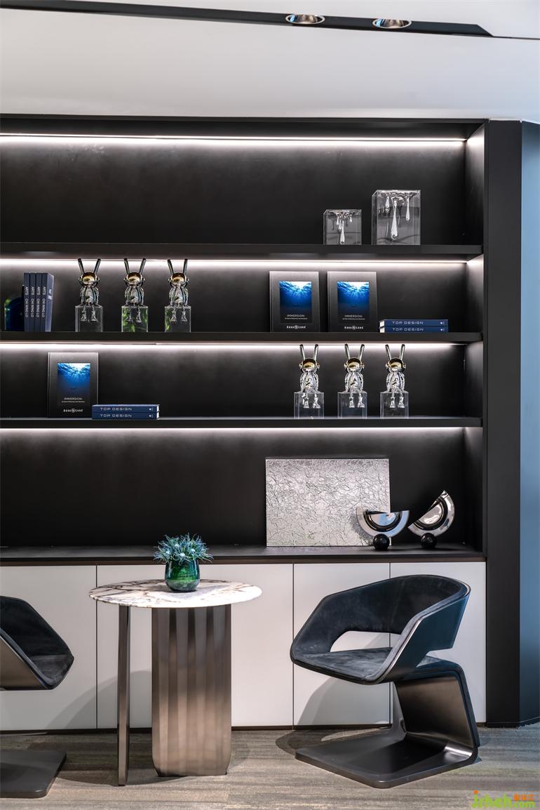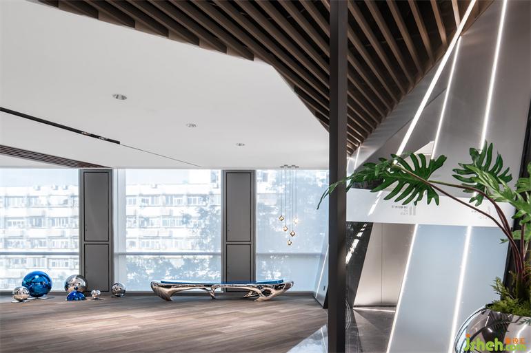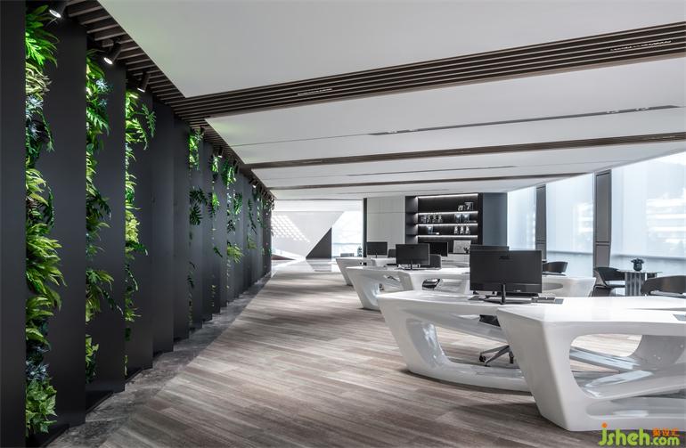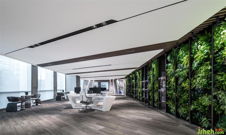 在空间中设置大面积的绿植墙,让窗外的景观及与室内空间达成一种交互对话, 给予沉稳的空间带来一幕跳跃气氛。