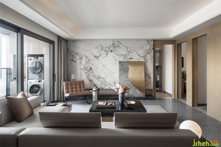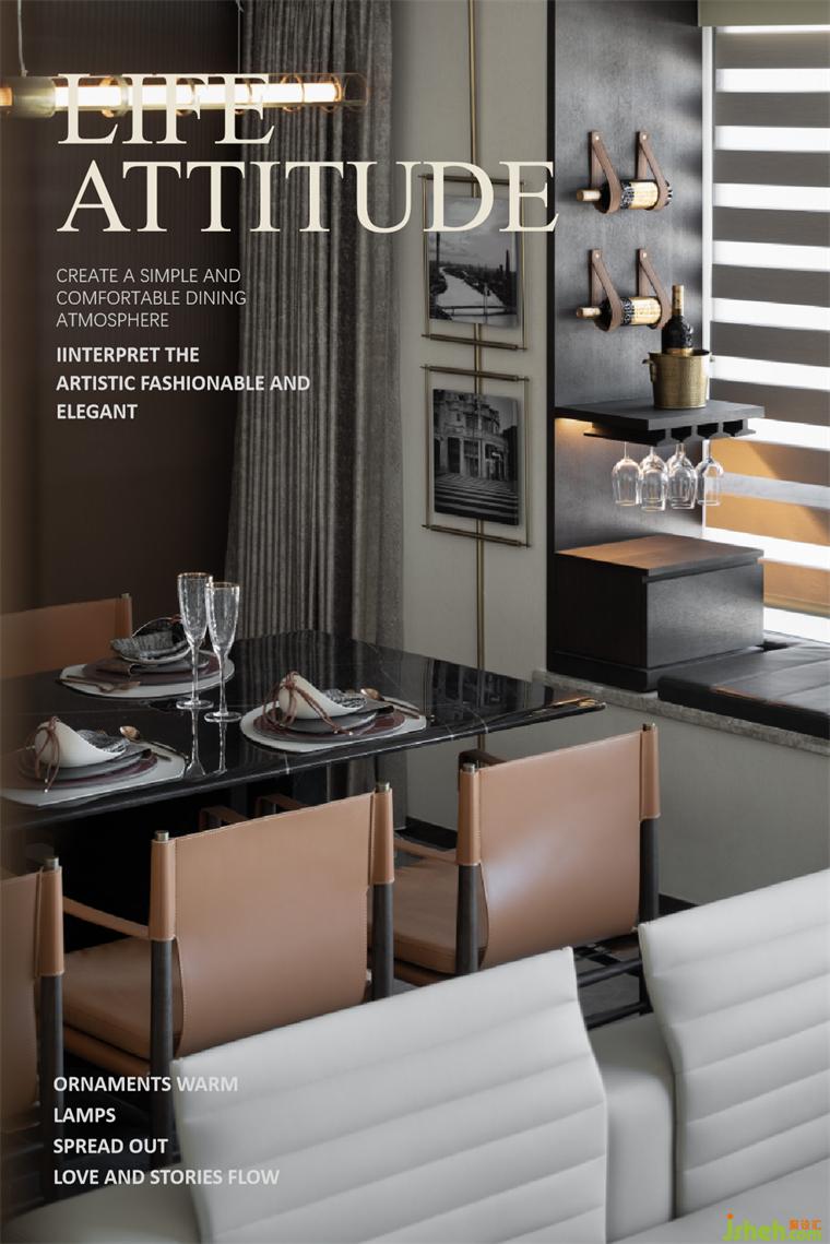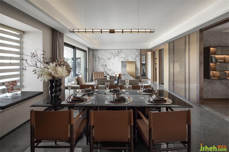 跟随墙面的摄影作品,我们看到了男主人对于生活感性的一面,样板房设计他们对于自我的释放是内敛的、稳重的,咖色桌椅与大理石形成统一视觉,笔直的线条呈现简约低调的空间气质。