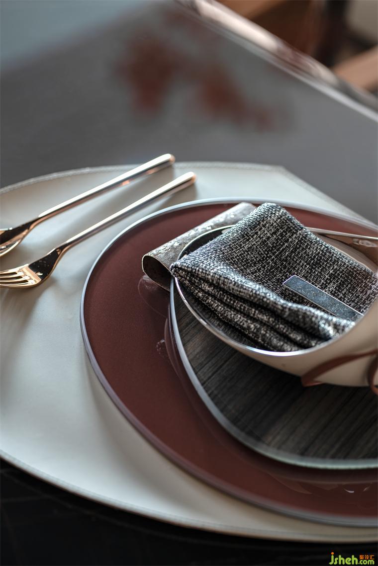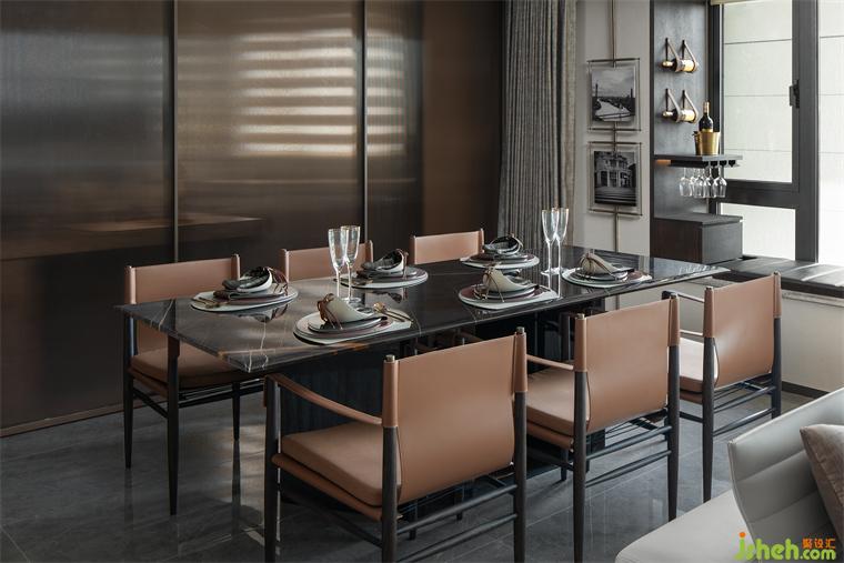 餐厅除了满足基本的功能性需求外,通过金属、样板房设计大理石等材质形成视觉碰撞,打造一座开放的、兼容生活品质的国际化新都会生活体验。