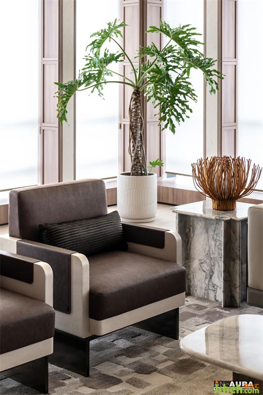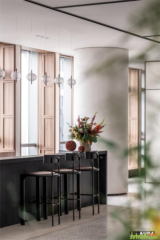 座椅形态选用棱角分明,围造休闲安宁的洽谈氛围,流线形制贯穿水吧区一路延展,装修公司引导访客随境心转的体验,在一步一景中产生不同维度的感受。