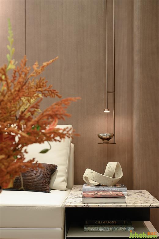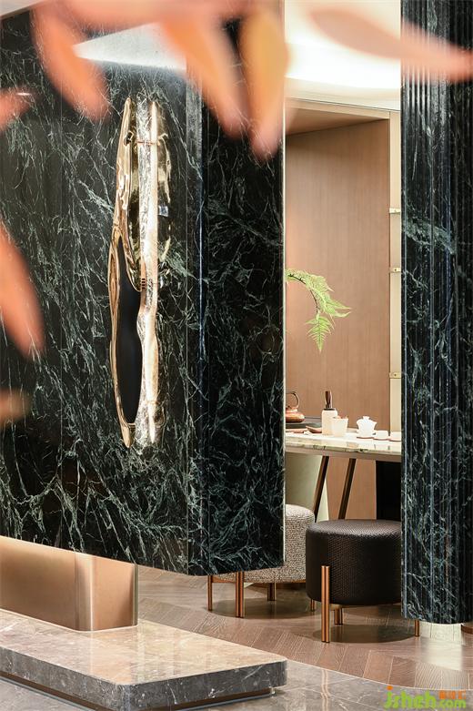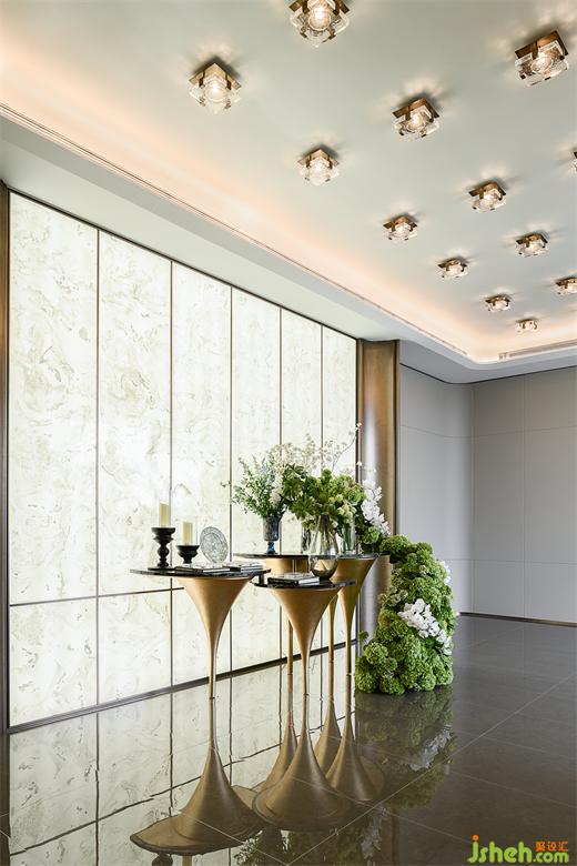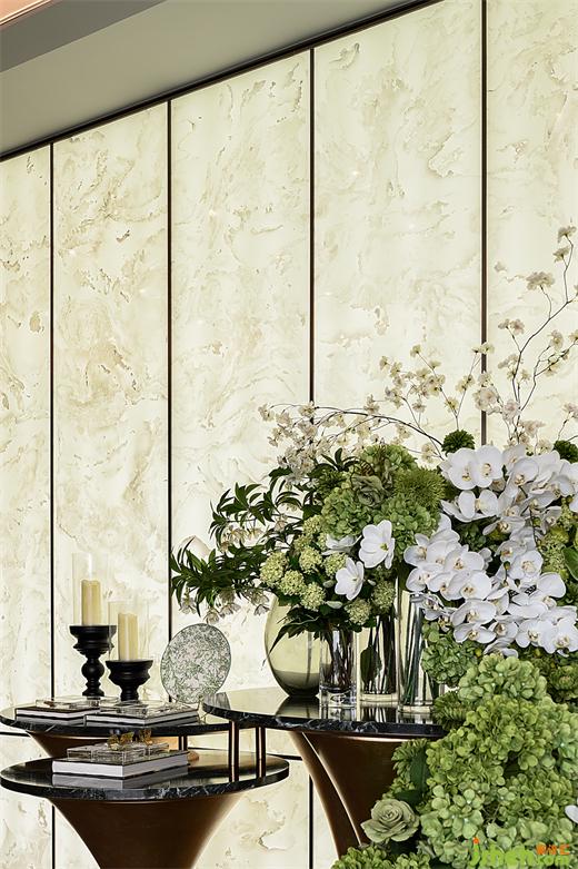 入戶大堂的空間中,水晶燈與大理石牆麵的紋理共同編織出一幅低調奢華的視覺交響曲,样板房设计金色支架與花卉相映成趣,展現了高端生活的藝術氛圍。