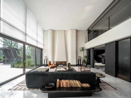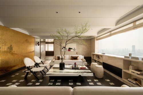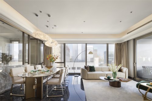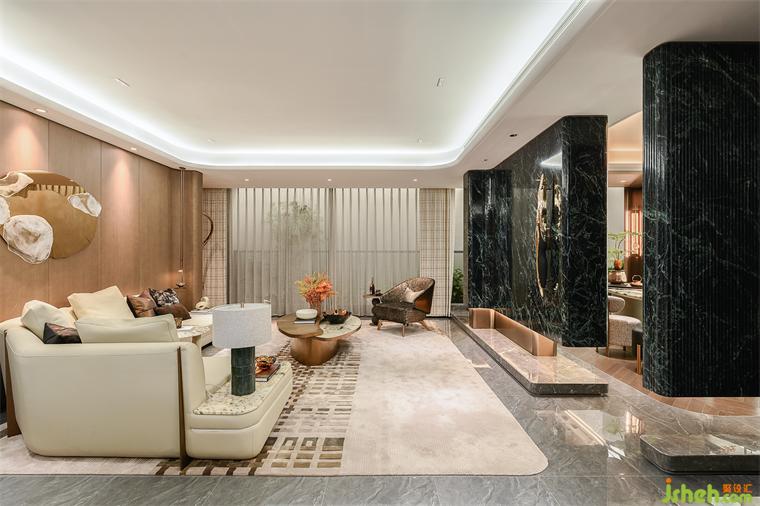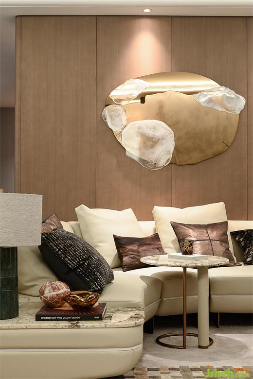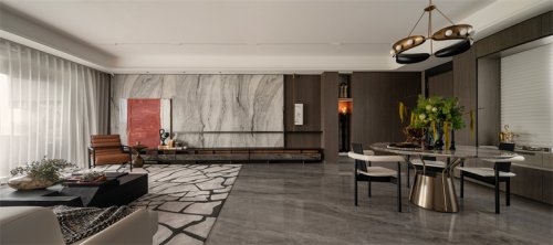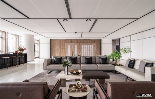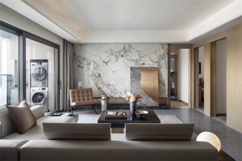 客廳空間以流動的光影與質感交織,微光輕觸,样板房设计隱喻深沉。簡潔精緻的陳設蘊藏着深厚的文化意涵,既冷峻又溫潤,演繹出無聲的優雅與永恆的哲思。