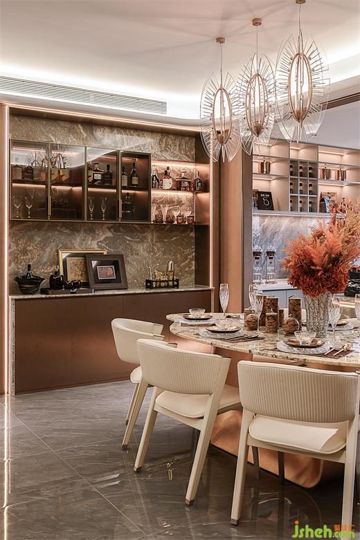 餐廳空間宛如時光中的靜謐角落,燈飾如同懸掛的星辰,样板房设计將微光散落在精緻的餐桌上,營造出一種如夢似幻的氛圍。
