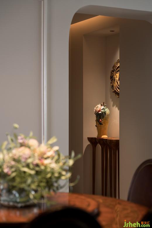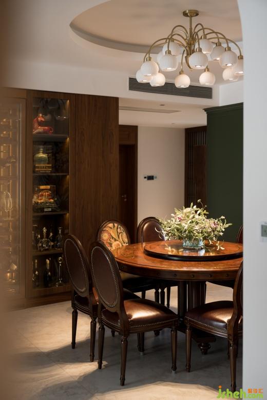 餐厅里的木质餐桌椅,承载着生活的小确幸,复古的艺术灯散发出柔和光晕,餐边柜摆满复古的摆件兼酒柜,每一件都有粗狂与艺术的气息。