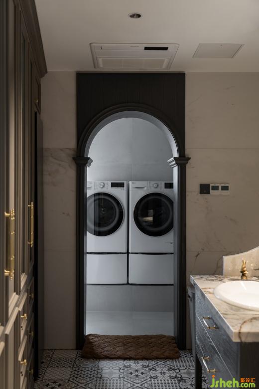 住宅设计分了两组洗衣机烘干机,主客分开使用更方便。业主说最好用的还是衣帽间的干衣柜,方便实用还不占地方,和衣柜融为一个整体。