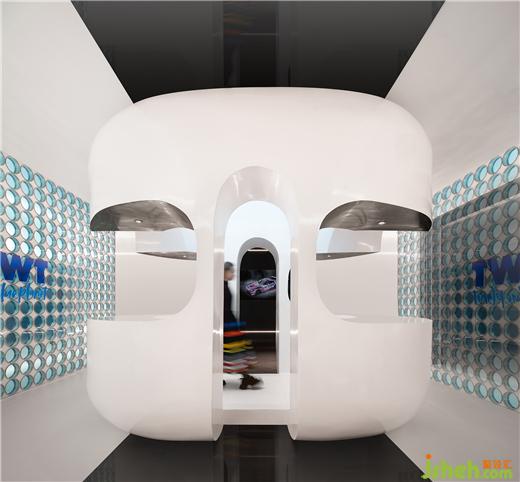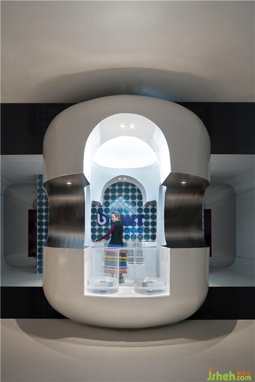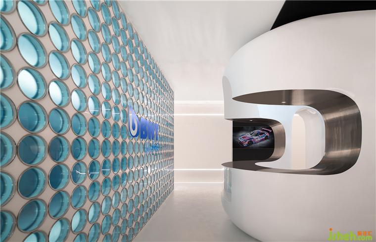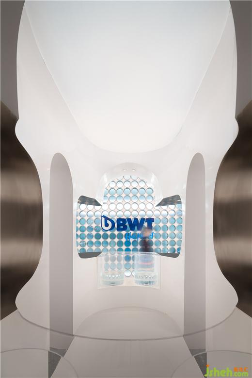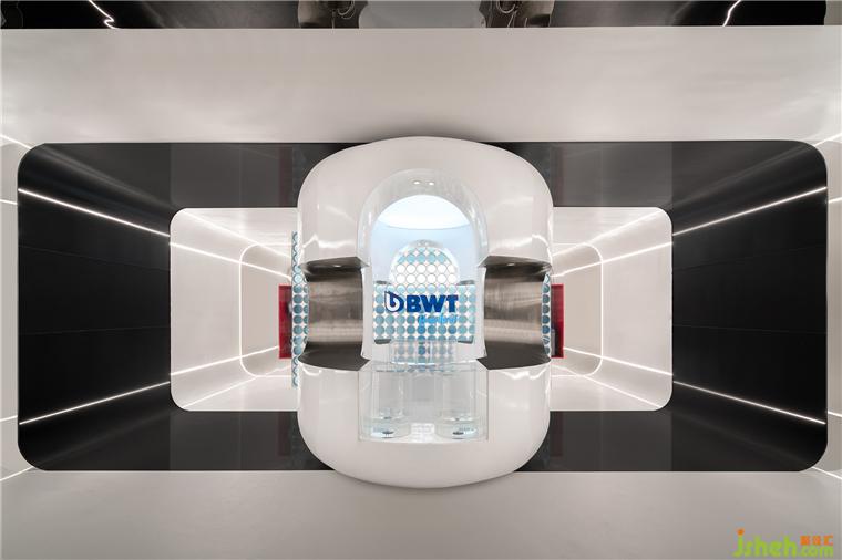 空间中这个形似胶囊的物体,体验中心设计灵感来源于BWT独有专利技术中的镁离子,四周的黑色环形面将其包裹,当他们整体出现在人的视线中,黑色则自然的消隐,将人视线的主角落在形似胶囊的物体上,成为空间的主体物。