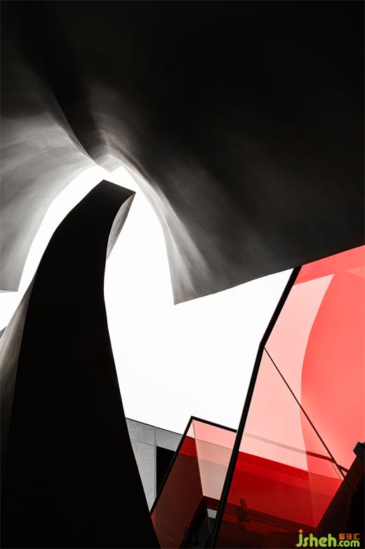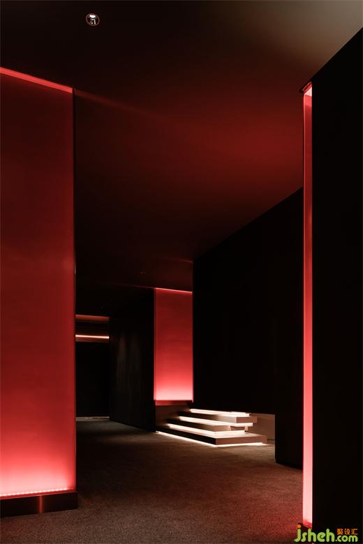 展厅设计灰黑的肌理色调与简约的直线造型,自然带有旧上海照片的气氛。青碧的池水与绛红的玻璃如时光美酒,熏染着欲醉的倒影。稍憩微微,以备踏步而上,粉墨登场。