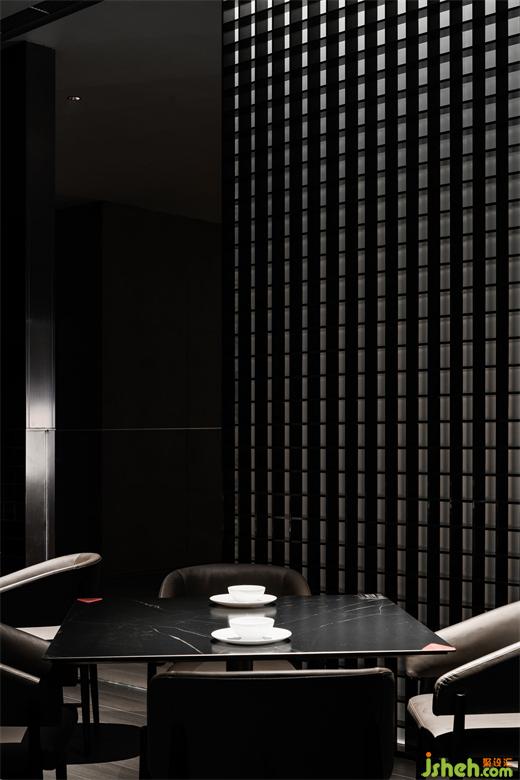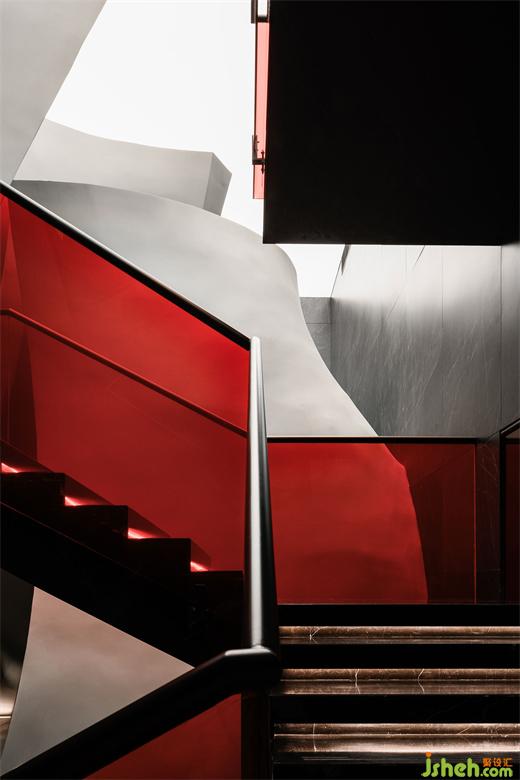 The grey-black toned texture and simple linear forms naturally evoke the atmosphere of old Shanghai photographs. Turquoise pool water and crimson glass, like vintage wine, infuse the surroundings with intoxicating reflections. Briefly pause, ascend the steps, and make a splendid entrance.