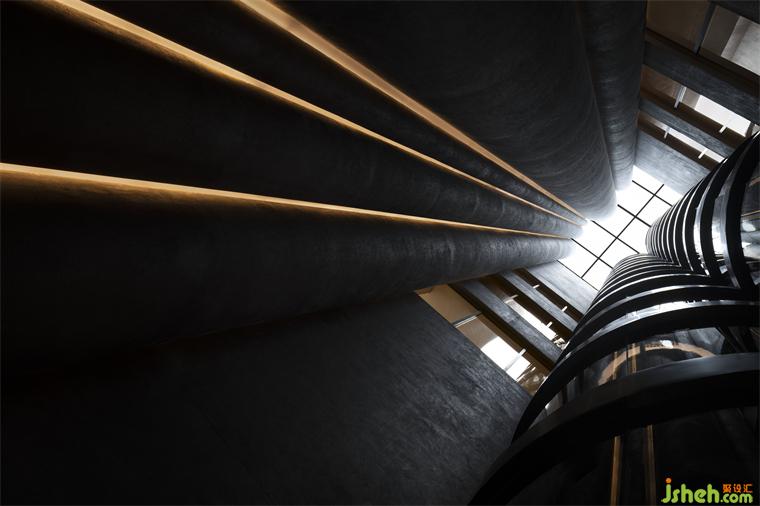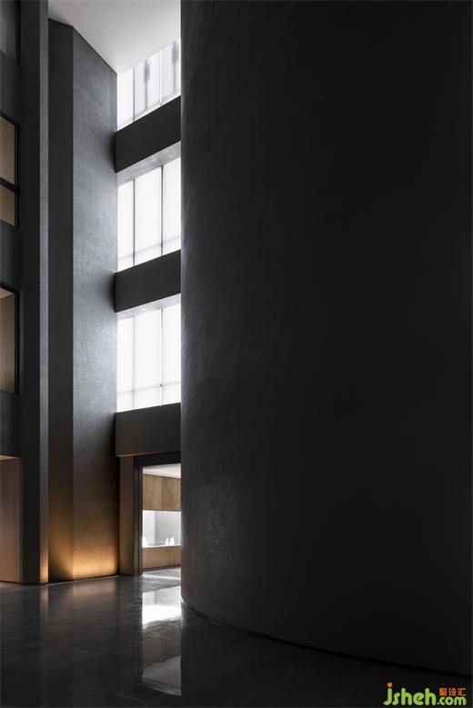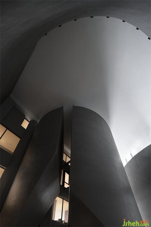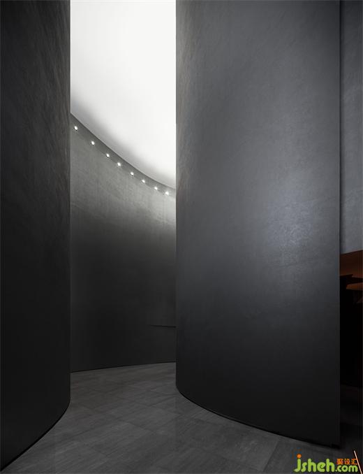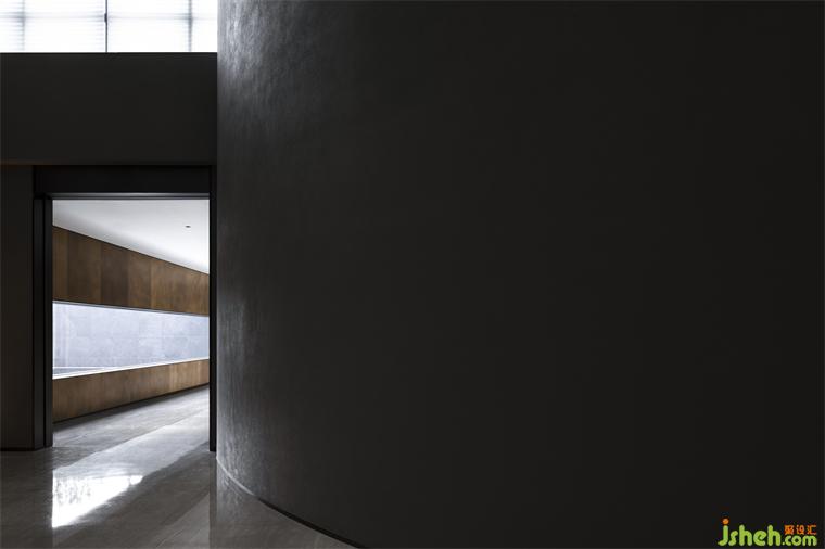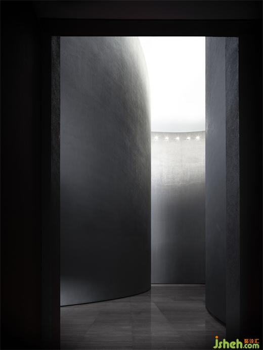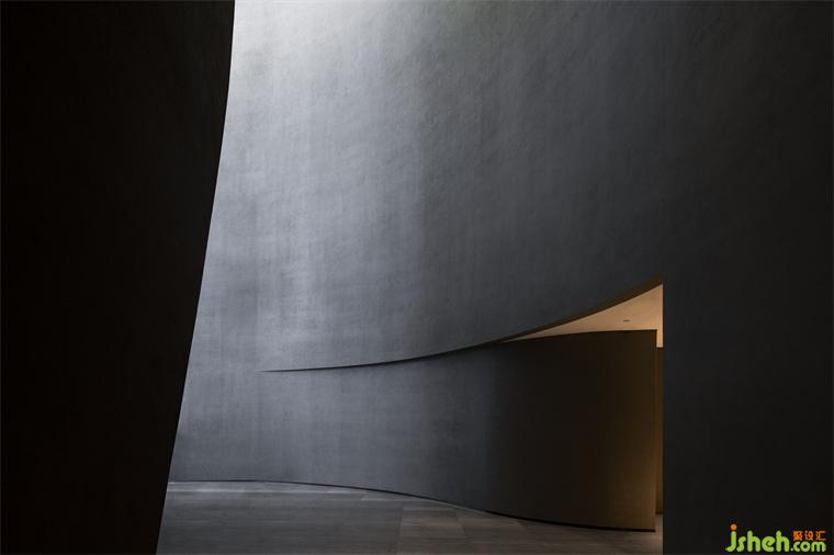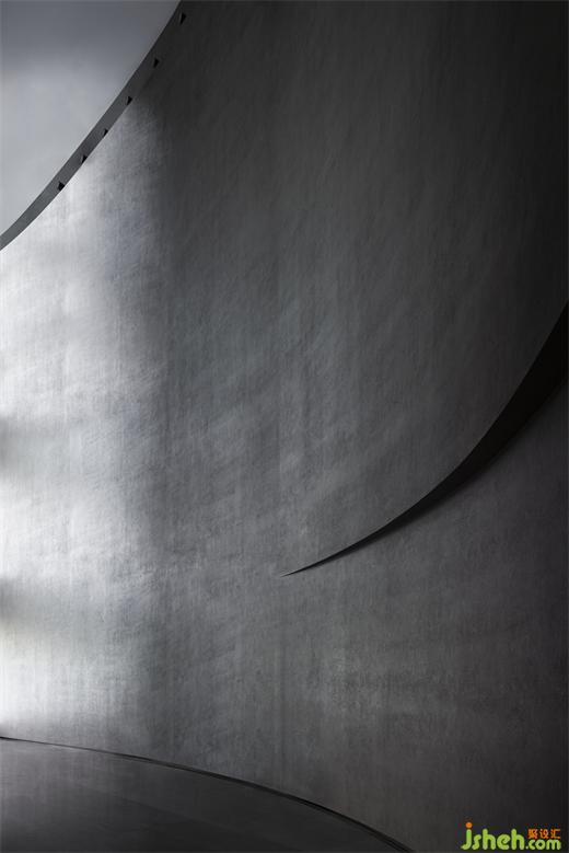 度假酒店设计长长的弧形墙面如风化的山石,尺度宏大、厚重古朴、不加装饰,具有沧桑的力量感。约四层楼高的极致灰色体量,在寸缕天光的照射下让人想起信仰空间的神圣以及柏拉图的“洞穴隐喻”,彰显出沉静而深邃的磅礴之势。