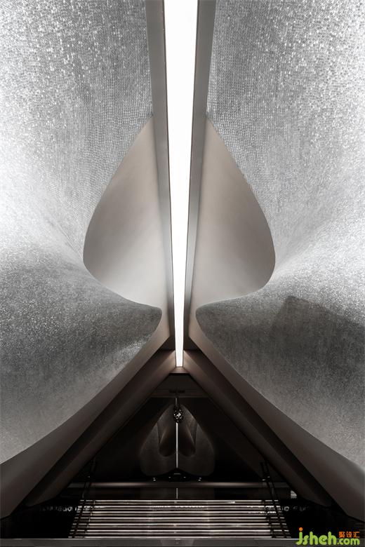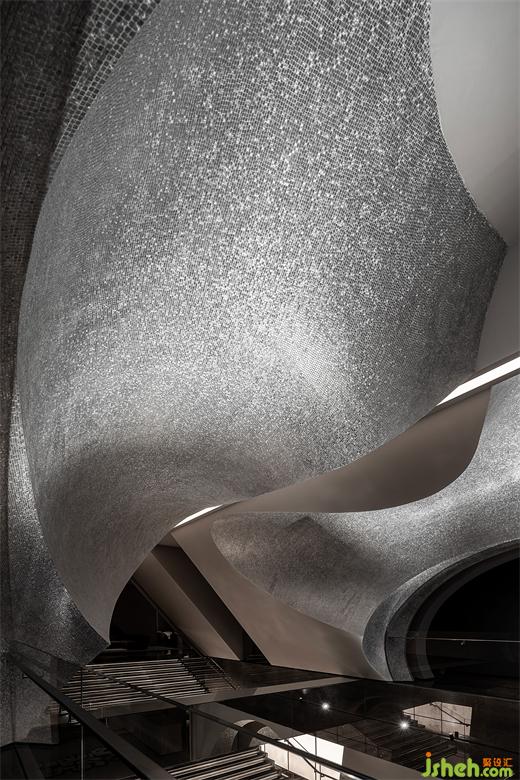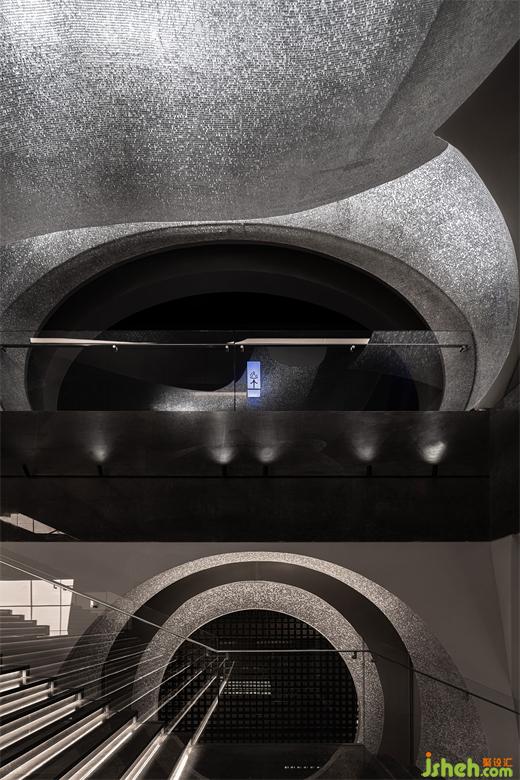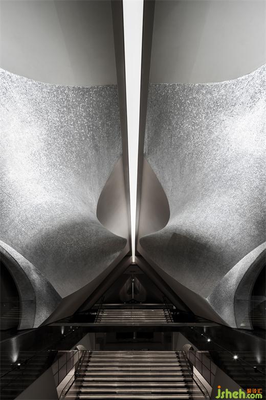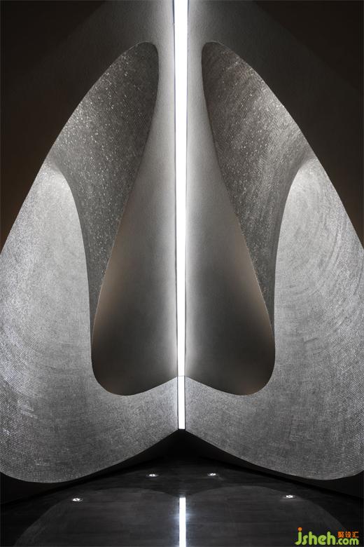 宏大的巨型雕塑式对称空间和幽暗基调,是心灵之旅的序曲。天花如水流般蜿蜒,弧形墙面包裹出一座内建筑。光线在马赛克表面反射出不同的色彩和质感,传统手工艺与现代建筑在此相遇。