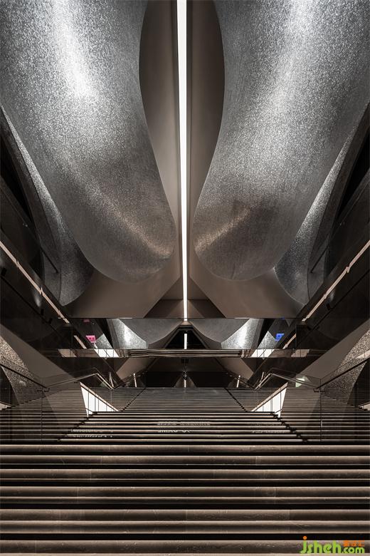 沿着中央光带的指引,踏上连接天地的绵延阶梯,向着心灵深处的神秘迈进。墙面上跃动的光影,仿佛生命的脉搏。