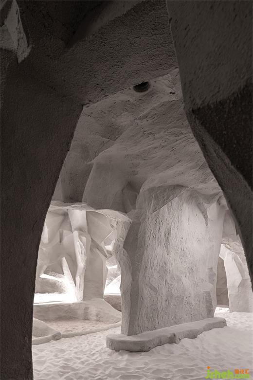 块面感的岩石肌理写意出洞穴般的原始质感和粗旷力量。慢射的光线温柔地抚触着岩壁。洞穴曲线和阴影交织出深邃而古远的氛围,仿佛穿越远古时代的神秘圣地。脚尖踏入沙砾的一瞬,集体无意识被唤醒。时间在此刻停滞,与天地融为一体。