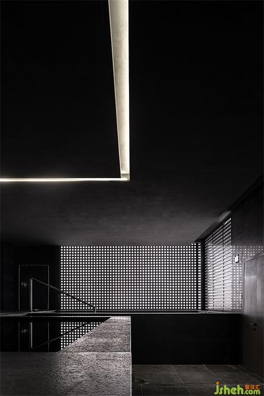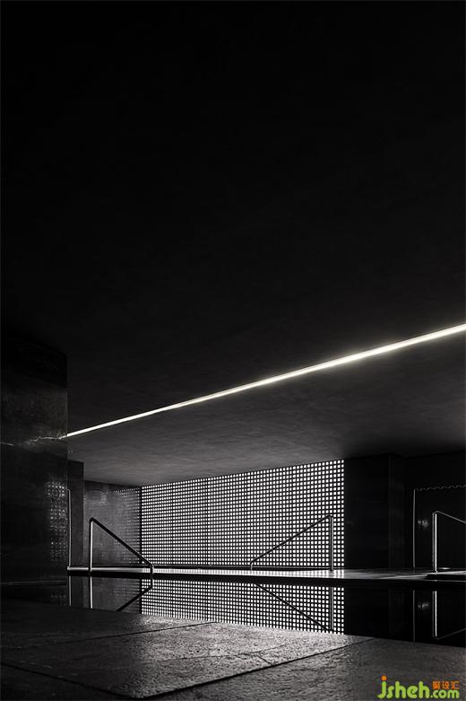 上海洗浴设计天花板上的细长光带与纤细的金属扶手彼此呼应,现代感与理性美构成一幅极简主义画作。平静的水面仿佛一面通向未知世界的镜子,诉说着时间的流逝与永恒。幽暗的空间传递出生活哲理与情感共鸣。