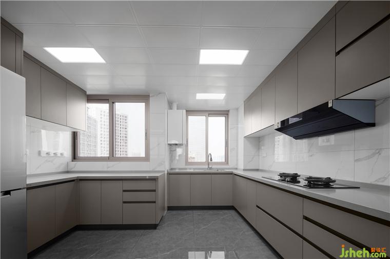 封闭式厨房,给女主人划分出属于自己的烹饪空间,大面积的咖色加以黑色线条点缀,复式装修设计简约且与房屋的整体风格相呼应。