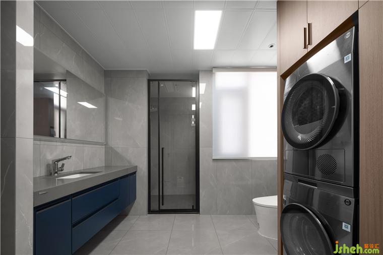 卫生间将极简主义贯彻到底,复式装修设计以灰色水泥瓷砖做底,白色点缀其中,淋浴房的设计以黑框的玻璃门干湿分离,空间显得简练而明朗,浴缸的加入更多了一份品质生活的仪式感。