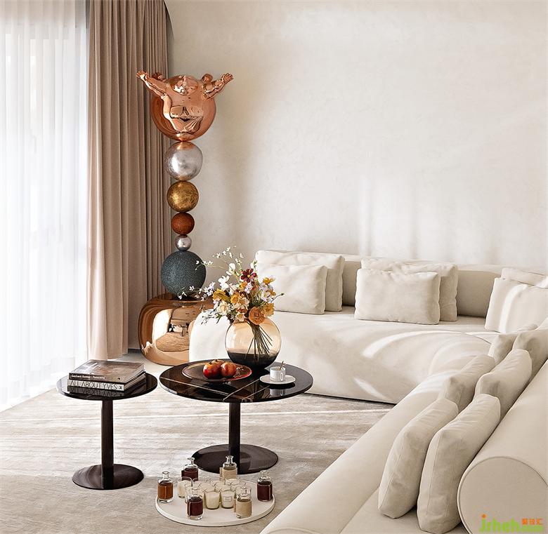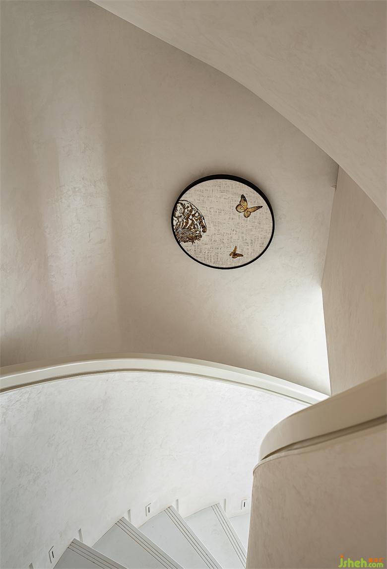 “虎与蝶”的装饰画植入了整个会客厅的不同区域,包括各个走廊,圆形画框呼应廊道弧线,廊道蜿蜒而下,像一张卷曲的画卷。南宁别墅装饰空间在光影的变幻下,灵动而飘逸,美感与灵性带来的滋养,让精神层面的憧憬,成为了可落地的栖居场景。