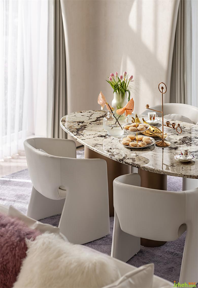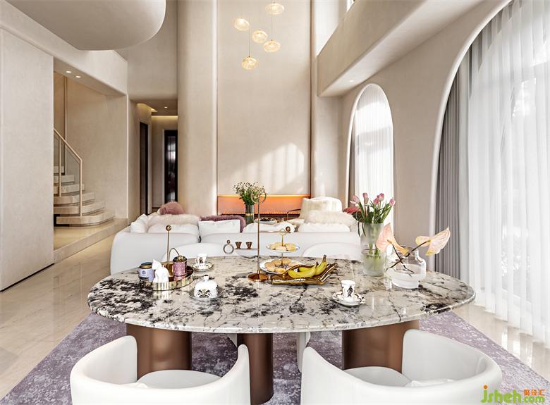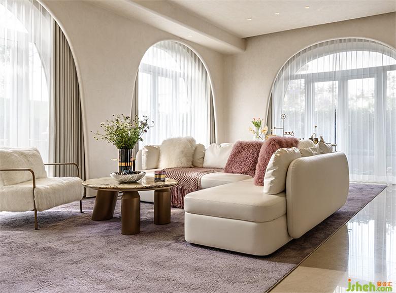 弧线感的家具与建筑呼应成一体,木槿紫地毯巧妙的打破了空间沉闷感,在优雅格调的另一面,把印象带回《千与千寻》的紫暮晚霞。
