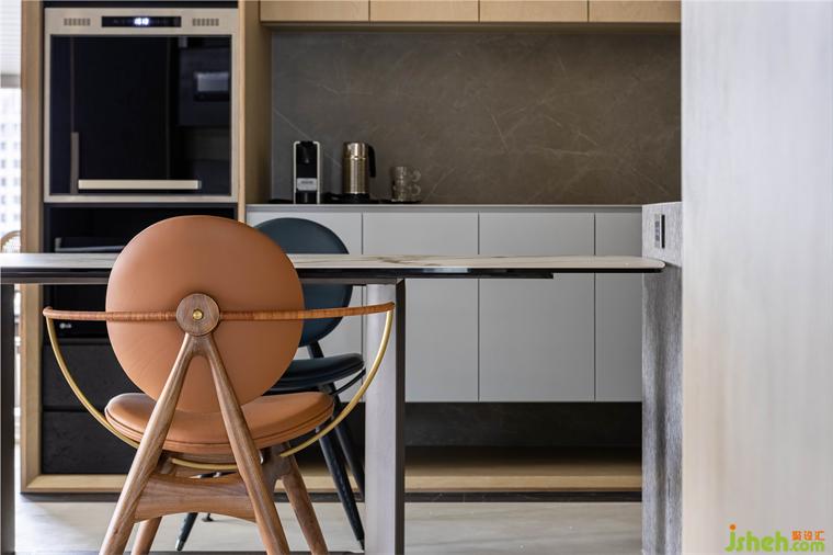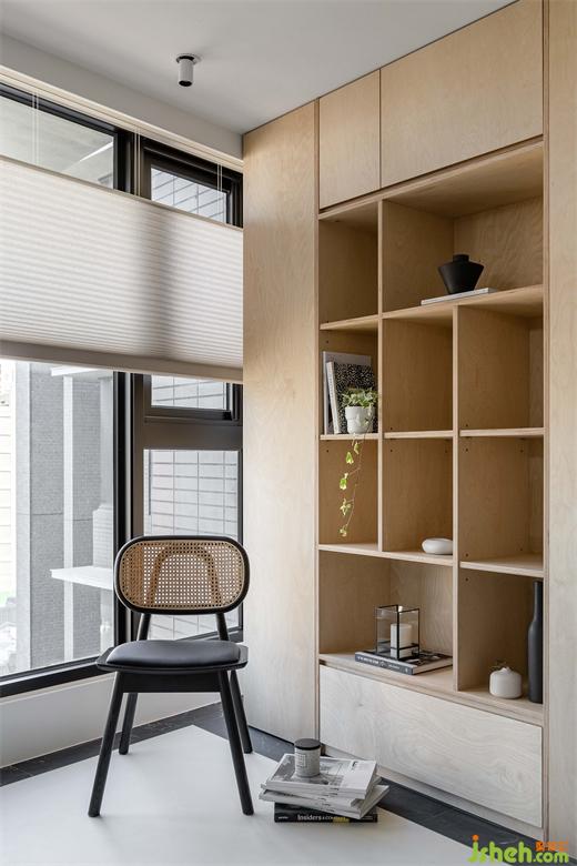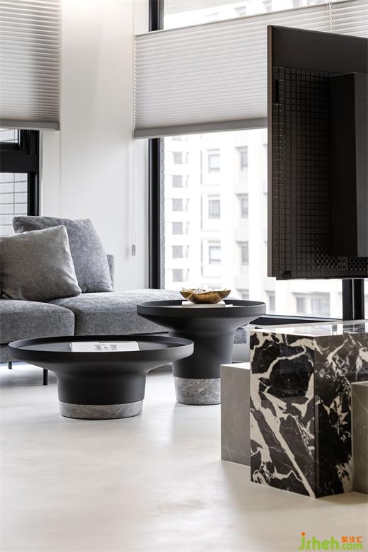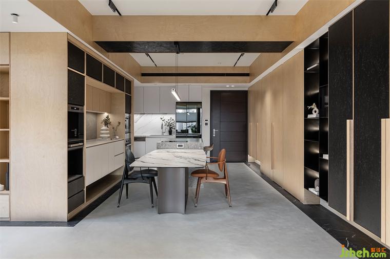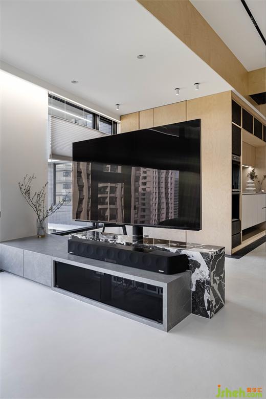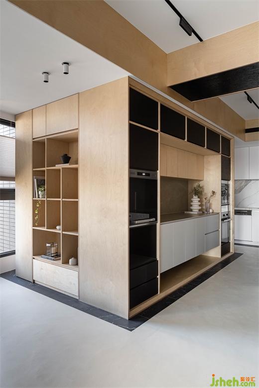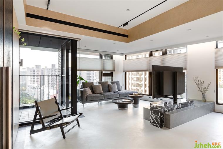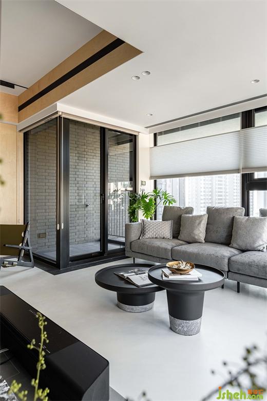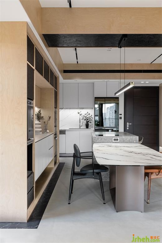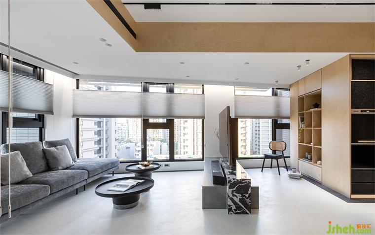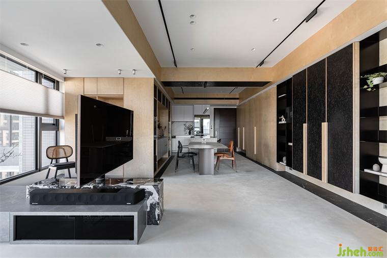 屋主向往南半球注重生活的步调和与自然共存,家居设计团队将此哲学完美地落实在本案的实作里,几个场景的设定,特别是对澳洲生活哲学「悠闲(laid-back)、开放(open)、趣味性(fun)」的诠释,成为本案的设计核心。玄关入门,右侧是公领域,左侧在桦木门内则是三间卧房和卫浴空间。公领域的厨具由低调的白色系开放厨房沿伸至中岛,与简约白灰调中岛呼应的是带有桦木和黑色OSB板做门片的电器柜轻食区。以室内的结构梁做为分界,空调管道与灯具有秩序感,合理的暗示餐厅,阅读区和客厅各自的空间场域。休闲感的桦木搭配对比的黑色OSB,由平面的黑色地砖的围绕向上延伸至天花的线条,共同形成框景将视觉聚焦于窗外景致。公共区域地坪皆使用机能型特殊图料,光影的变化映照在地面上,不同时段都有自己独特的样貌。
