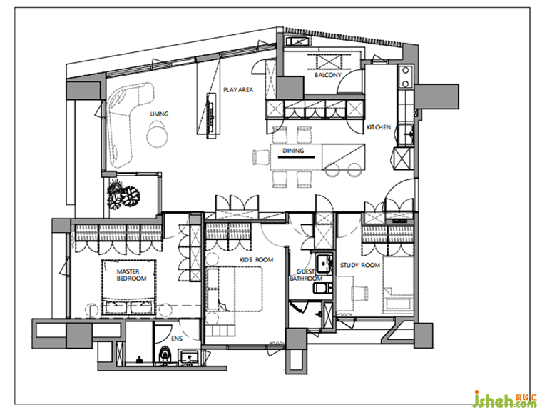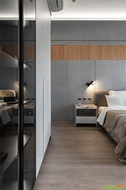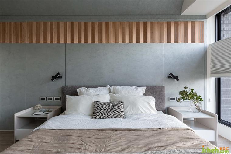 屋主向往南半球注重生活的步调和与自然共存,几个场景的设定,特别是对澳洲生活哲学「悠闲(laid-back)、开放(open)、趣味性(fun)」的诠释,成为本案的设计核心。玄关入门,右侧是公领域,左侧在桦木门内则是三间卧房和卫浴空间。家居设计休闲感的桦木搭配对比的黑色OSB,由平面的黑色地砖的围绕向上延伸至天花的线条,共同形成框景将视觉聚焦于窗外景致。通过餐厅往客厅移动,在进入客厅前的一方天地,利用桦木设计了书柜,配合旋转电视柜的石材台面,此机能上也兼具多重作用,电视高低错落的台面既可充当儿童游戏的台面使用,也可当座位区。公共区域地坪皆使用机能型特殊图料,光影的变化映照在地面上,不同时段都有自己独特的样貌。