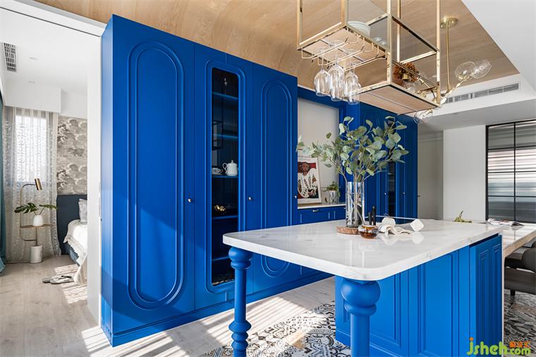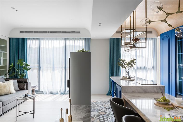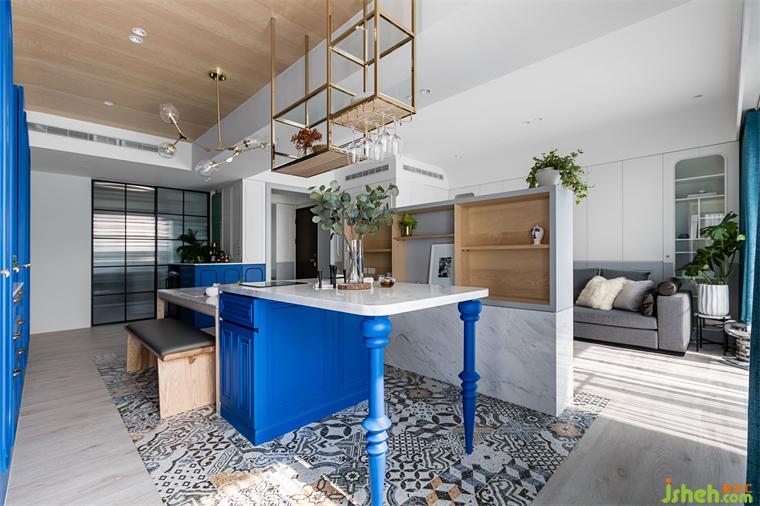 本案原为31坪的新成屋公寓,房型为双面采光, 其中一面采光为大片落地窗,不仅可眺望远方山区,自然光也被大量的引进,形成得天独后的日光宅。女屋主本身钟情于蓝色调,希望设计师能够将地中海蓝调带入到他们的新屋,大平层设计让他们回到家彷彿是来到两人在渡假时的美好时光。