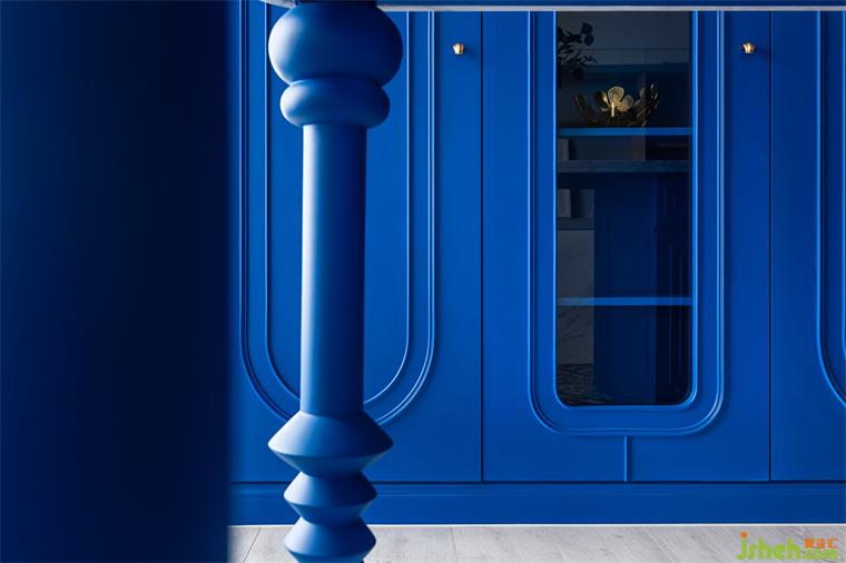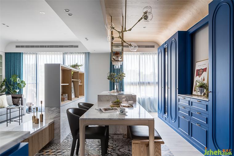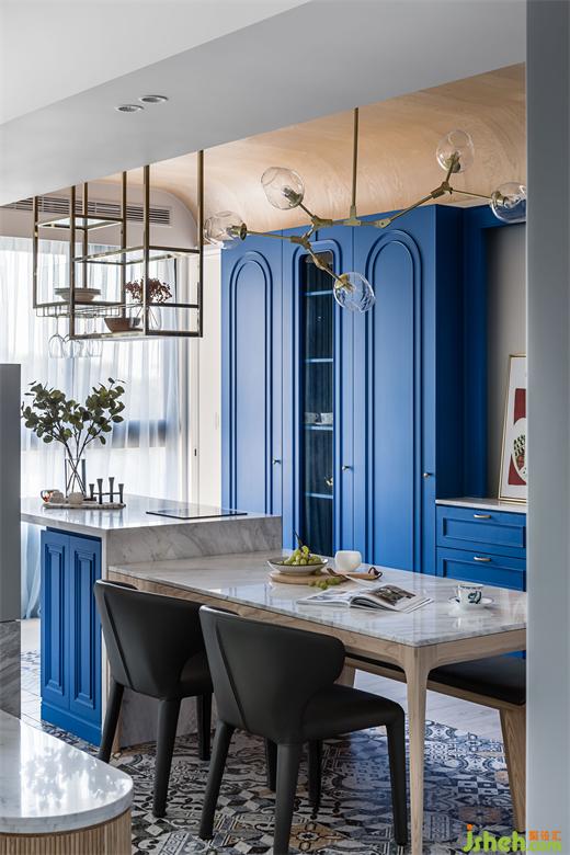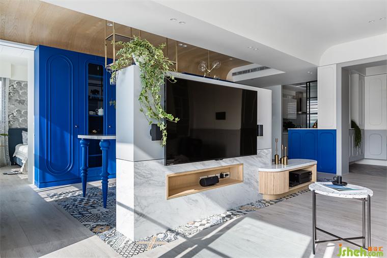 客厅与餐厅原为同一个开放公共空间区,为了营造西班牙南部的热情与缤纷,大平层设计师以餐厅为视觉焦点,地板铺设磨石子花砖,彷彿是一片大地毯,从餐厅下方扩散到半高的电视墙,将丰富的餐厅色彩延伸至客厅。餐厅上方天花为弯曲的古典线条,木皮顺着圆弧型的天花接到展饰柜,呼应花砖活泼的色调。像西班牙人的热情奔放的性格色彩一般,运用到家居设计中,热情与冷静在里面柔和,奔放洒脱中又不失稳重厚实,用斑斓的色彩和舞动的纤细纹路合力展现时尚个性,让空间盛满活泼青春的韵味。半高的电视墙也跟随着圆弧的设计,设计师利用小圆木棍做子弹型的矮机柜,增加木皮层次感。电视柜刻意做一高一低,降低入门口的视觉压迫。电视柜下方与餐厅中岛皆为典雅银狐大理石材质,与花砖形成视觉上的平衡。