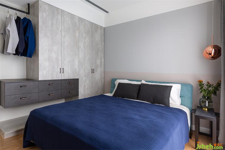 全室空间,无论是电视柜,玄关柜,一直到主浴的柜体,皆有温暖的橄榄绿搭配金属手把,为黑白灰的空间做加温的动作。来到主卧,深蓝色的主题墙,搭配玫瑰金吊灯,营造温暖又神秘的私人休憩空间。男主人拥有众多的时尚单品以及收藏品,彷彿置身于精品馆。