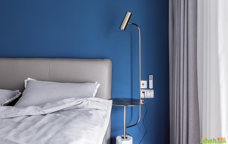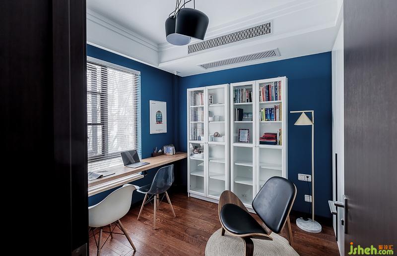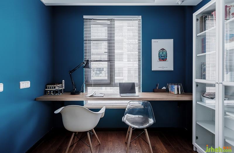 ▲书桌的面是一整块胡桃木桌面,黑色的工业风装饰帽子灯和台灯,在蓝色墙面漆下自然活波起来。