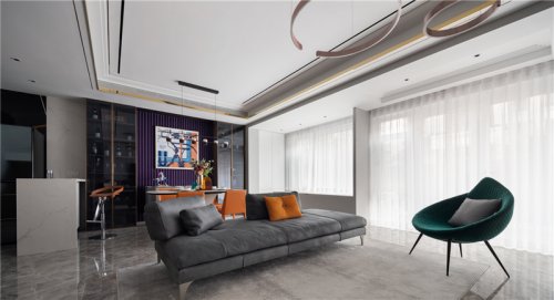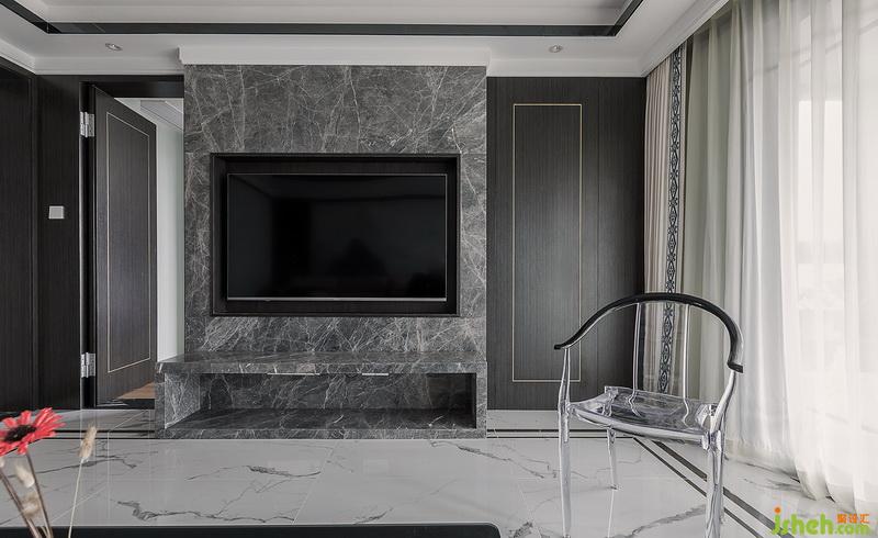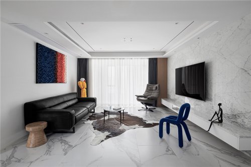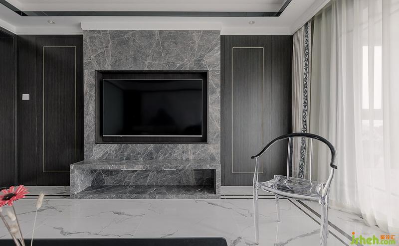 ▲电视背景墙是灰色石材调和大面积木饰面,也在体现东方文化的中庸之道,而亚克力材质设计的圈椅融合了东西方两种文化的符号,去表现这个空间的现代感。