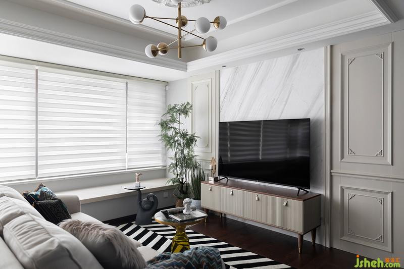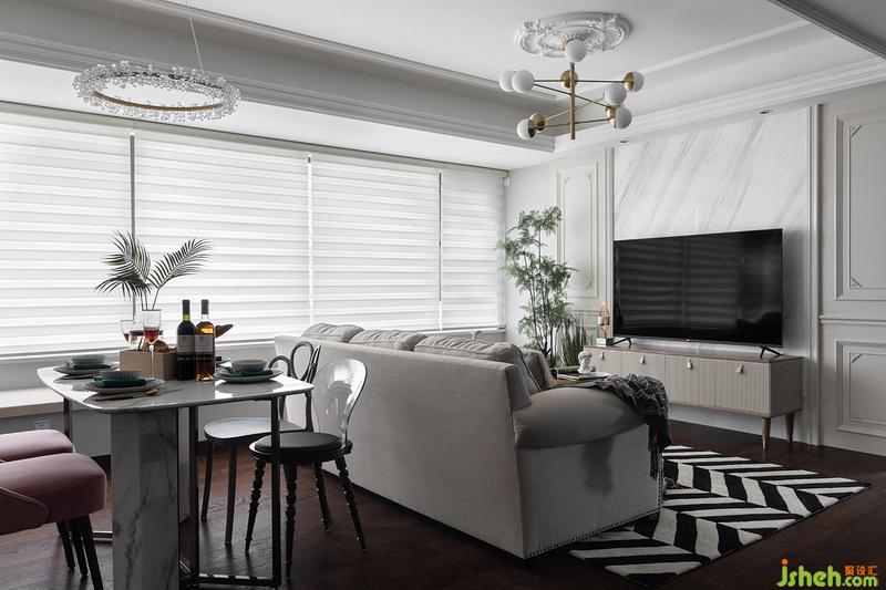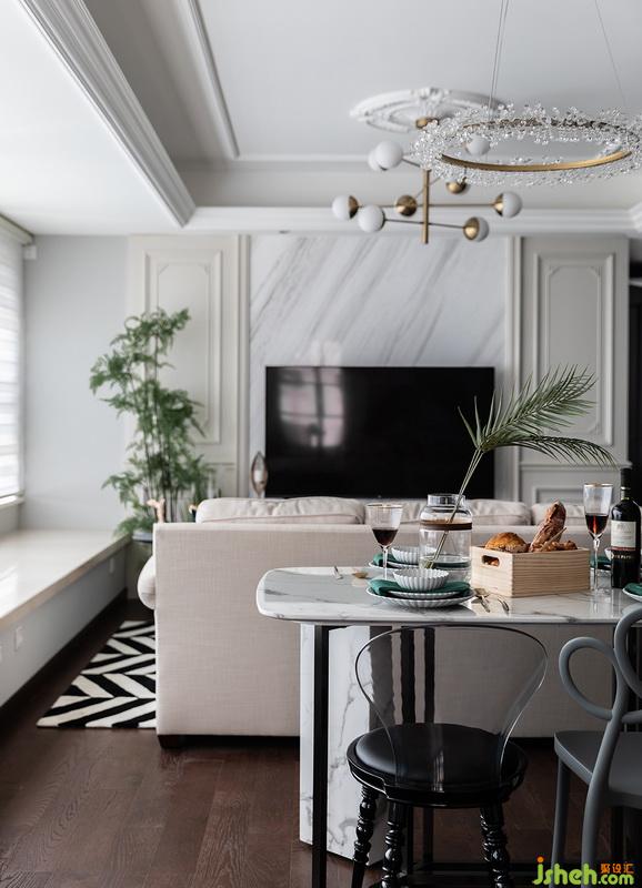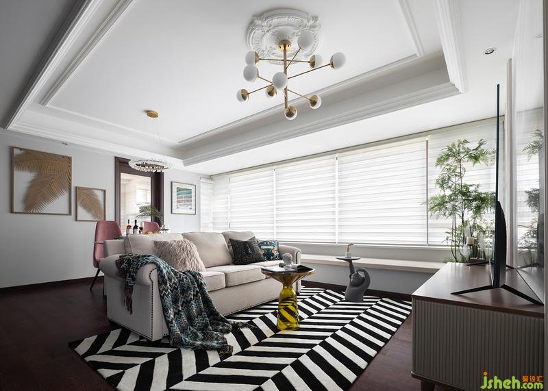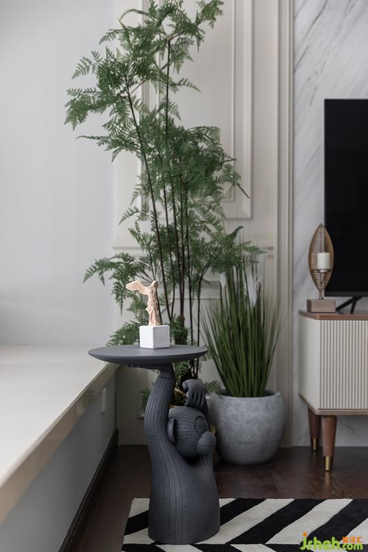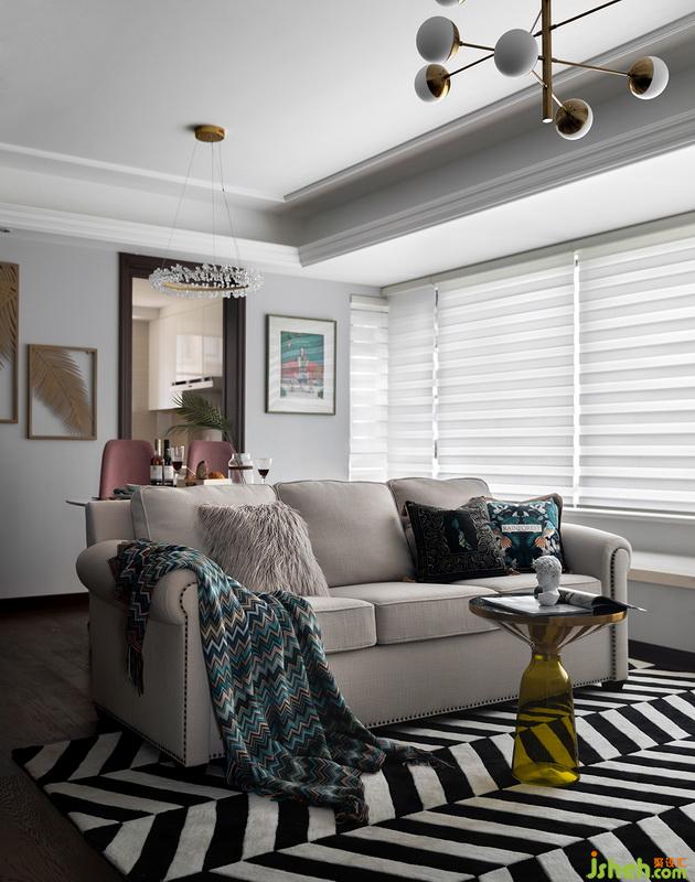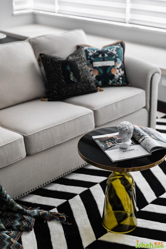 陈设部分希望饱有一点点复古感+生机,并不喜欢太过于老旧的复古风,做旧饰面的电视柜+粗麻沙发组合,用波西米亚风格的搭毯和抱枕去过度点缀;因为地板颜色和纹理相对于粗矿,设计师选用了黑白斑马纹地毯,连接家具和地面的和谐感,茶色玻璃茶几的出现告诉我们,我们的小主人并没有排斥现代生活元素,自由的空间一切都随心所欲。