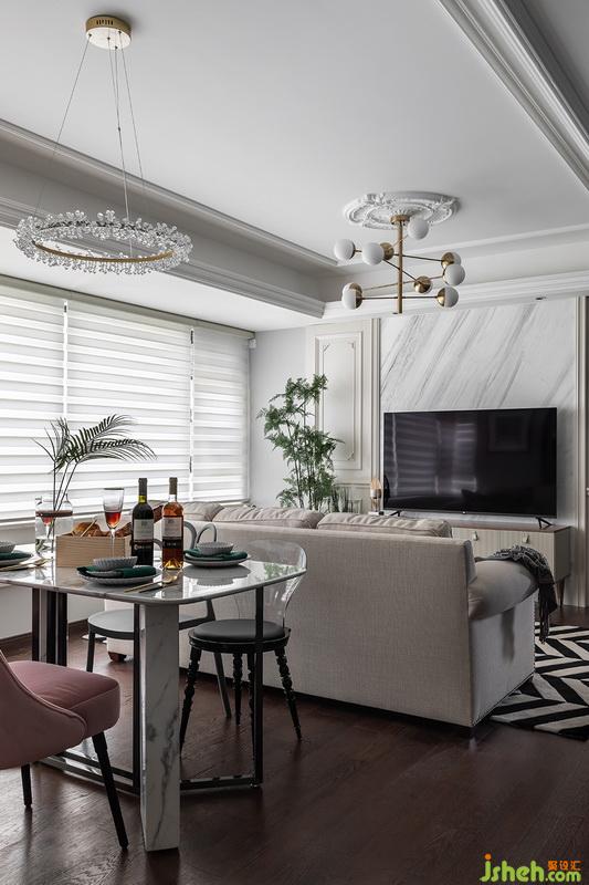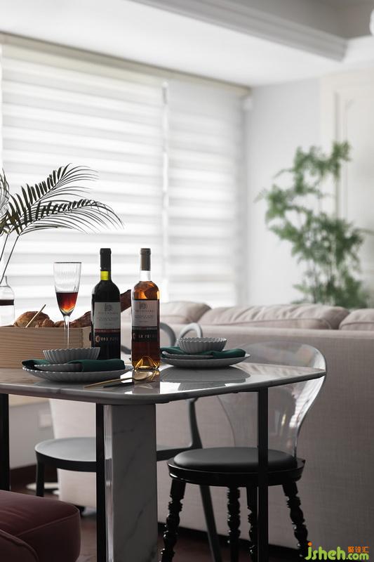 走廊空间和起居室重叠是边套设计的常见组合,我们在这个空间和墙面的设计上,用了深灰蓝色去处理这个面,视乎大部分人对大面积深色的墙面是比较抗拒的,但是本案客厅朝东,大面积落地飘窗加持,采光方面足够保证,再沟通下一次过稿,所以业主对设计师的信任是非常重要的。