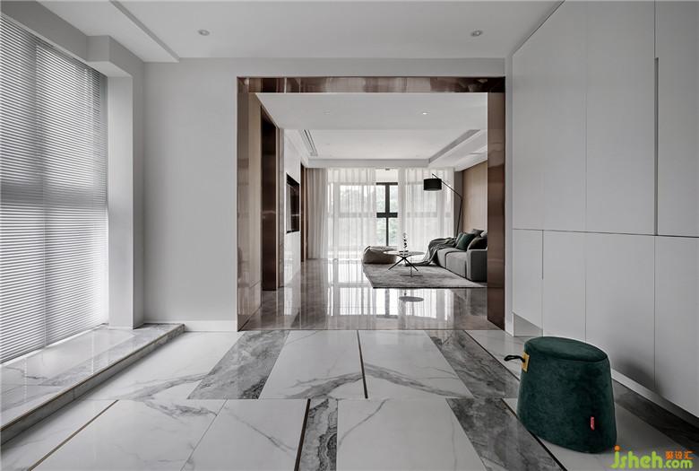 传统意义的大空间户型设计中,玄关会去做一些“围挡”,但此案中我们并不希望去做这些常规技巧,空间的通透和仪式感才会有张力,搭配整体落地玻璃窗让光线融合。