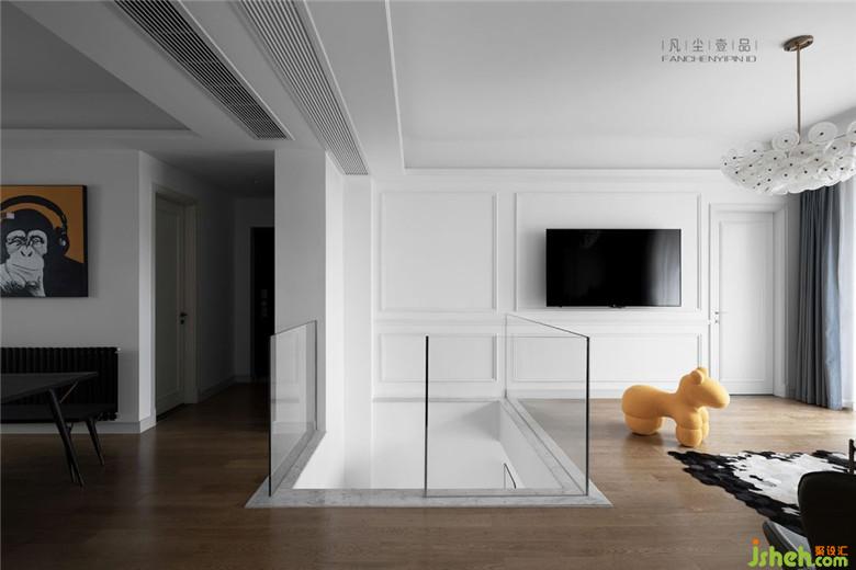 超白钢化玻璃扶手替换了原本的铁艺扶手,避免铁艺制品后期的腐朽问题,美观上打通了客厅和餐厅的两个视觉空间,让整个起居室不再因为户型设计的楼梯位子而尴尬,南北方向也便豁然开朗。