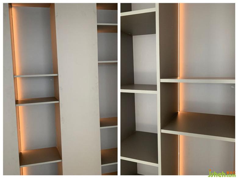 主卧衣帽间,层高≈2700mm,设计了整面到顶的衣柜,为了保证如此高度的门片不变形,采用了一体式铝合金边框拉手柜门,而上下各预留了0.5cm-1cm的空间间隙,