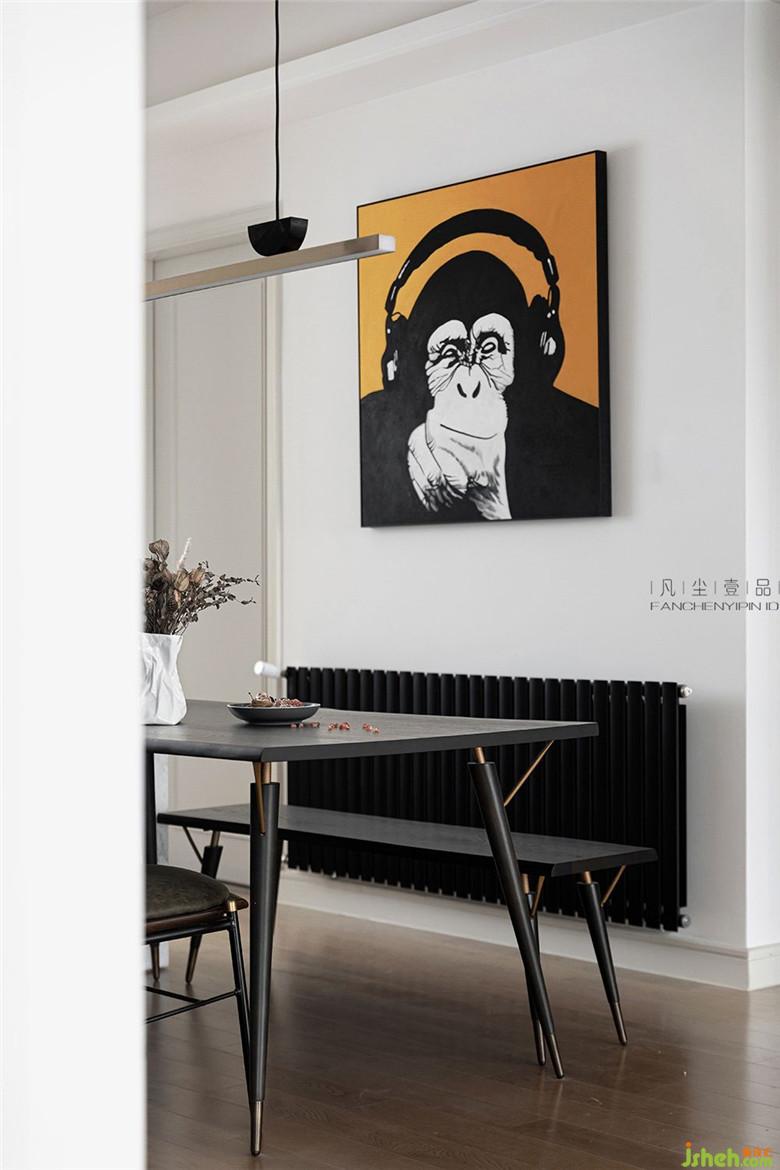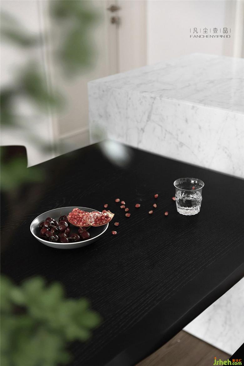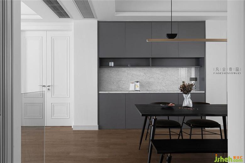 餐厅的中岛+餐厅组合,利用原本就狭长的餐厅空间,设计一体式内嵌烤箱和厨卫电器组合,解决厨房空间无法再增加这些功能的现实问题。