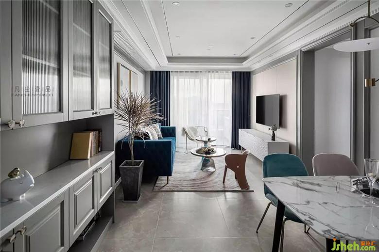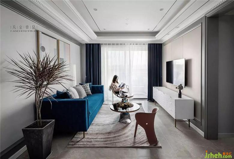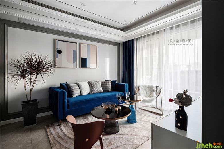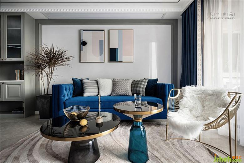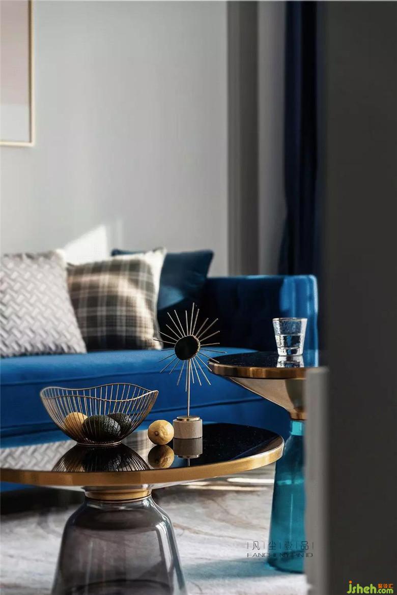 天鹅绒材质沙发,细腻的触感搭配金属镶边玻璃茶几,让客厅空间氛围透出轻奢的气味,经典蓝主色调贯穿其中,在不同材质上表现,丝丝相扣。
