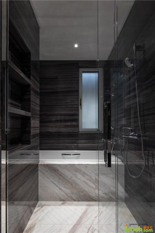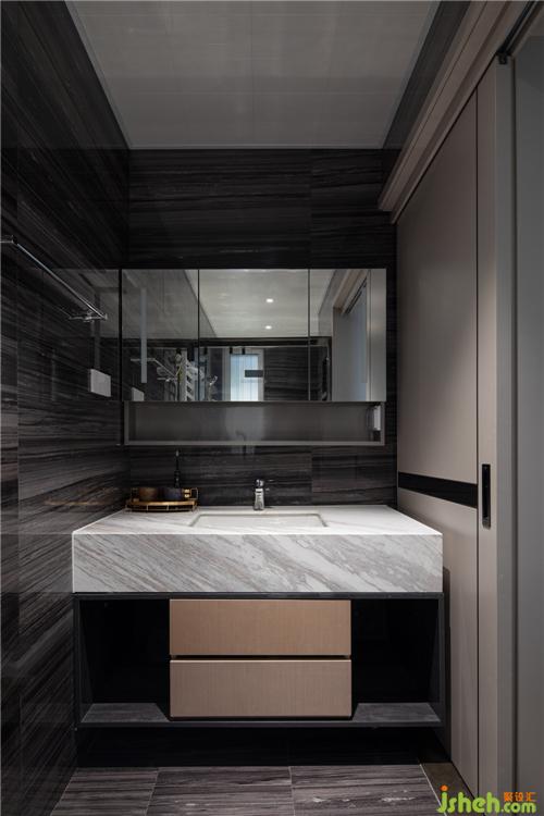 暗色系卫生间空间,联纹木纹图案,另辟蹊径又独树一帜,与现代潮流进行对话,提炼融合,让奢华从内而外散发。