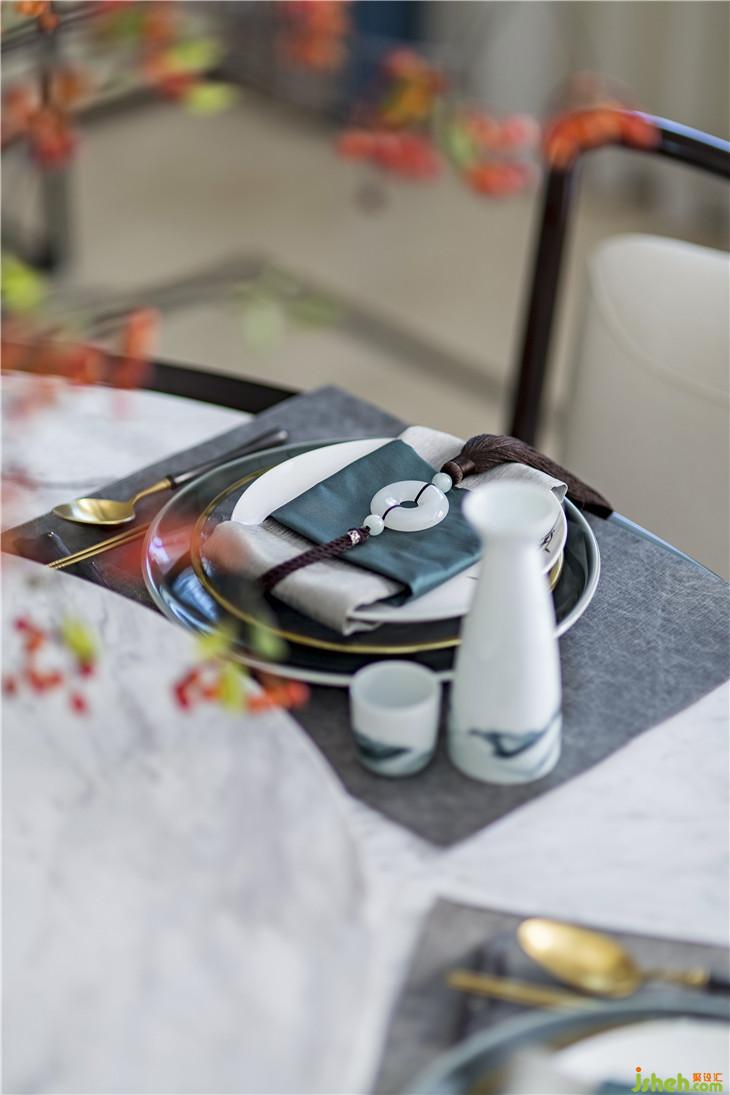 简约的空间形制,给予人一种回归自然、俯仰自得的圆融自在感,传统而温馨的圆桌,中式白瓷搭配肆意生长的枝桠、红果,别有一番鲜丽动人的意韵,居住的诗意成了餐桌上一小片风景。