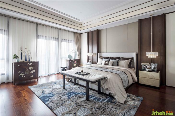 主卧套房设计整体呈现出雅澹明洁的视觉风貌,棕色的胡桃木饰面,细节处糅合着玫瑰金不锈钢,格调优雅,内敛自然。中式镶花装饰柜,自然云纹地毯,点染着传统文化的精妙笔触。盈盈自然光透过白色的纱帘,为空间带来一种安静祥和的氛围。主卧卫生间同样散发出素雅宁静的气质,一幅中式屏风,花鸟写意之间,自然灵韵悄然而出。