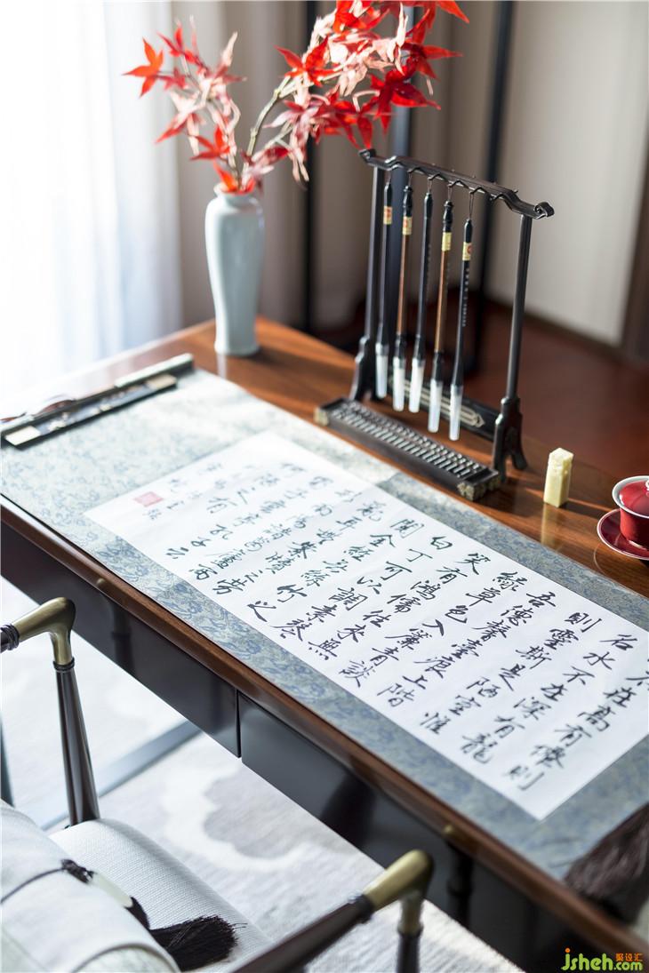 中式风格的空间,自然流露出一种经久不息的古典气质,以高洁素雅为尚。在书法室的呈现中,清贵之气与书卷气交融。“不要人夸颜色好,只留清气满乾坤,”元代诗人王冕的诗句,洋溢着磊落浩然之气,也凝炼在这个空间中。