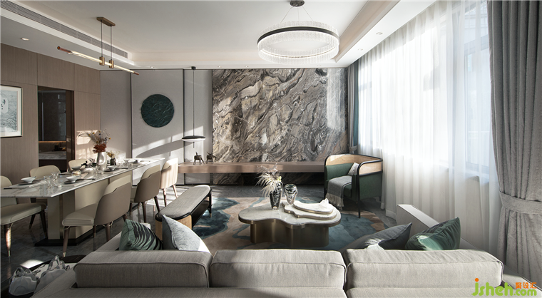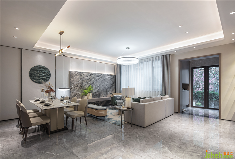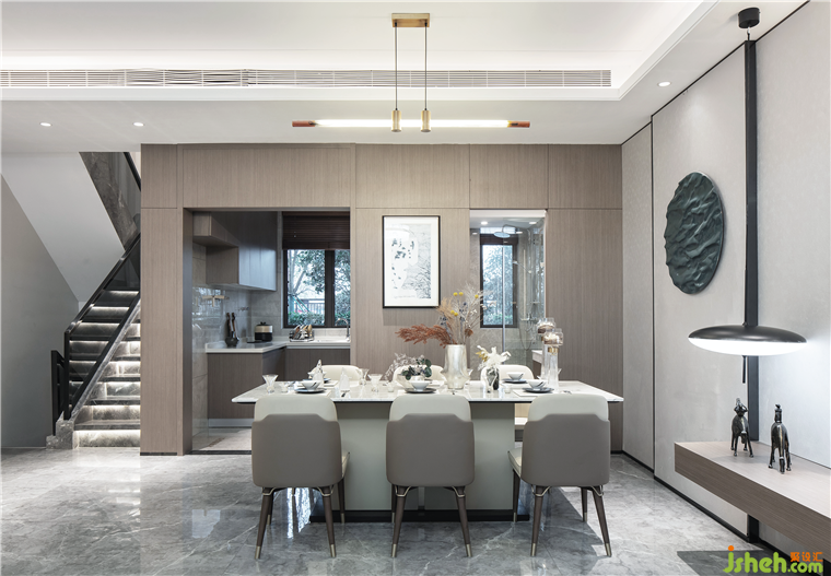 样板房设计大面积的大地色系,配搭古铜质感金属,灰色石材等,交织出层级分明的空间感,以沉稳而柔和的空间格调,引领人们傲世于喧嚣烟尘之外,开启不被打扰、时光悠然的优雅生活。