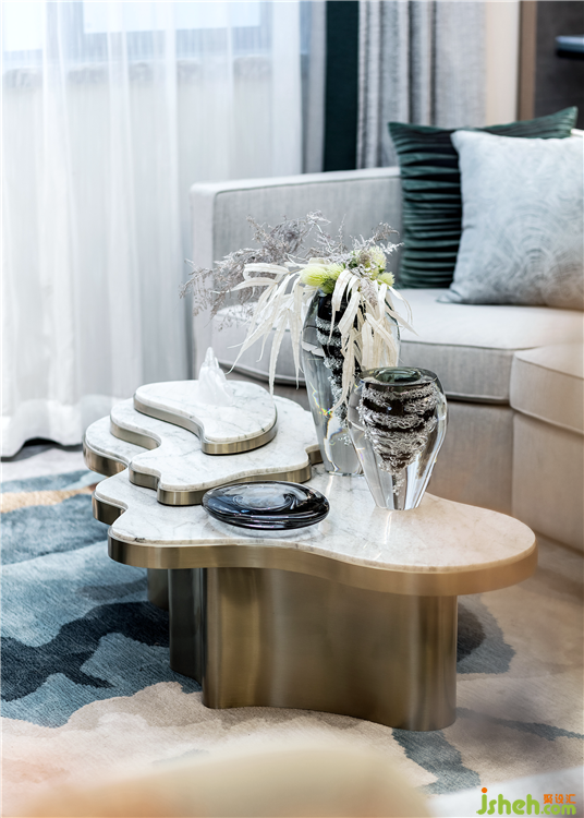 内与外的界限已然模糊,似离而合的格局形成一种连接,蜿蜒的茶几,灵感源于行云流水般的秀美梯田,将自然之美融于空间之中,流动的曲线感,赋予变化、起伏、生动的气韵。同时,理石与古铜材质的搭配,将现代感与自然的璞真悄然融合。