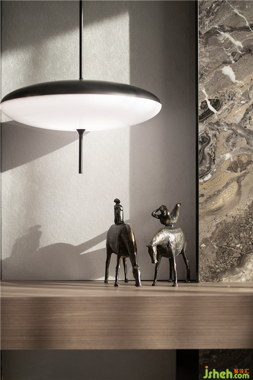 电视柜上的一对颇具野趣的小摆件,营造田野间放牧的悠然闲适,整个空间在传统与时尚、有序与无序、静止与动态、理性与感性之中自如切换,传递丰富、多变的艺术氛围。