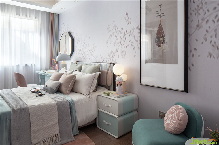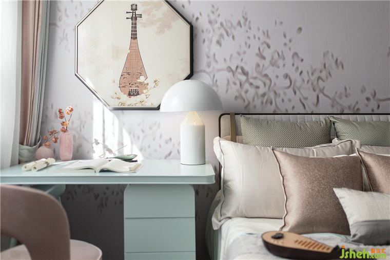 女儿房里,古朴的琵琶古琴装饰画,与极具东方韵味的装饰画框,为粉糯、阳光的空间氛围独添一种清淡、古韵的甜美,拾起一花,放肆年华。