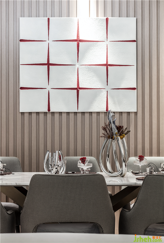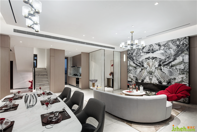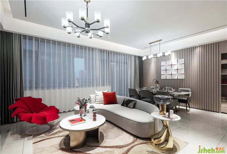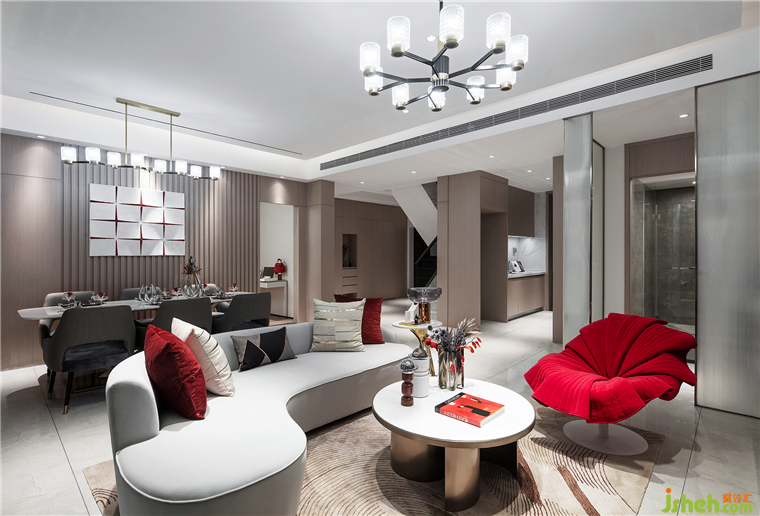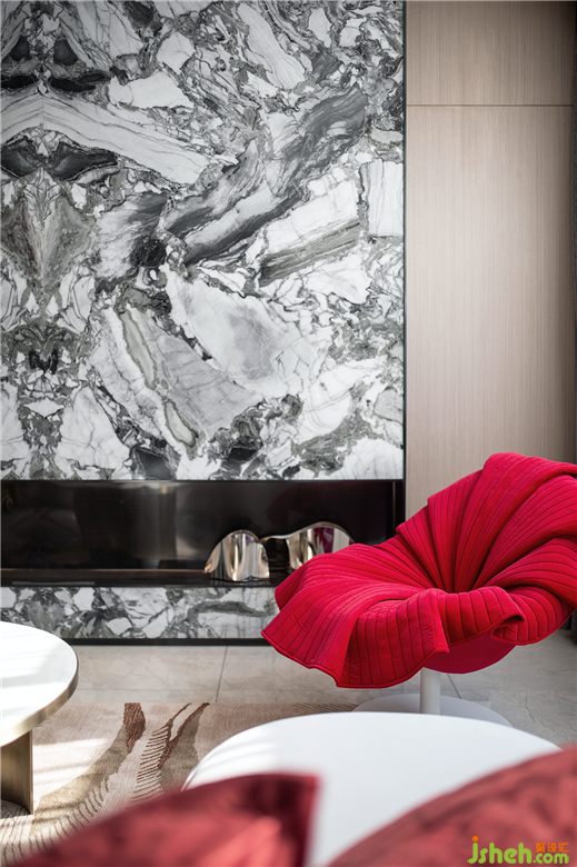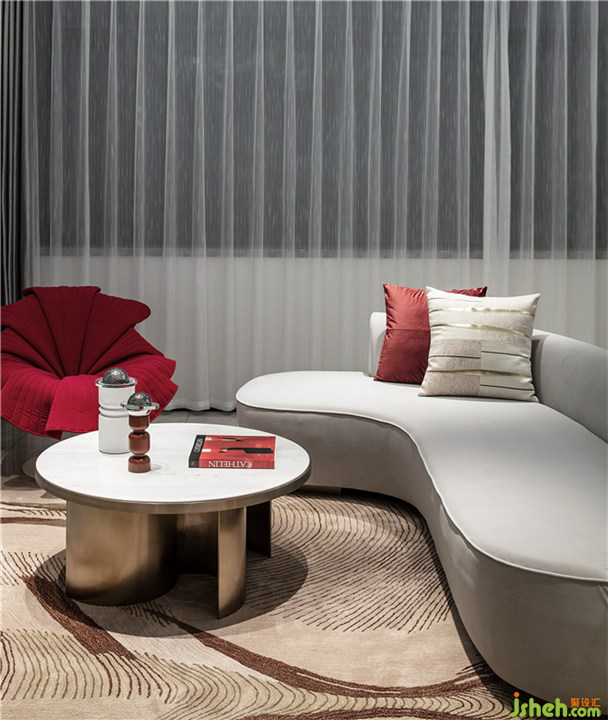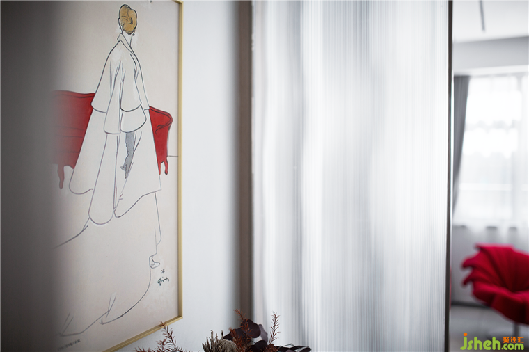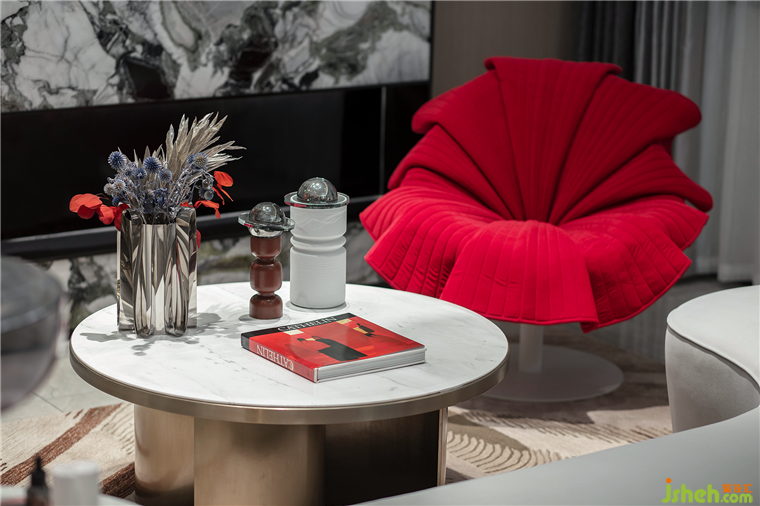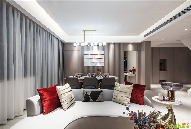 这是一个上层叠墅样板房,以极具女王气场的Dior999红,作为空间的主角,营造自信、洒脱的开场白,高调的红与低调的灰,两种极致的时尚色系相互碰撞,呈现一个新兴雅致的时尚况味。红色的沙发,恰如一朵盛放的红色玫瑰,展示秀美瑰丽的绝代芳华。