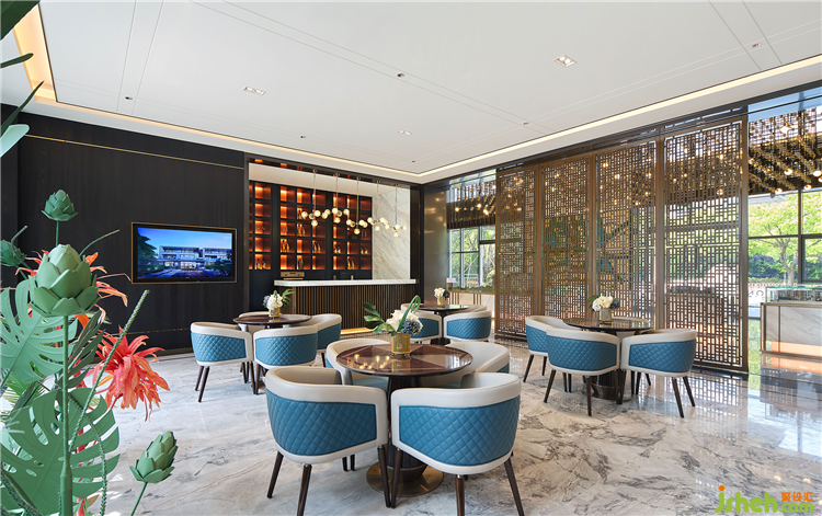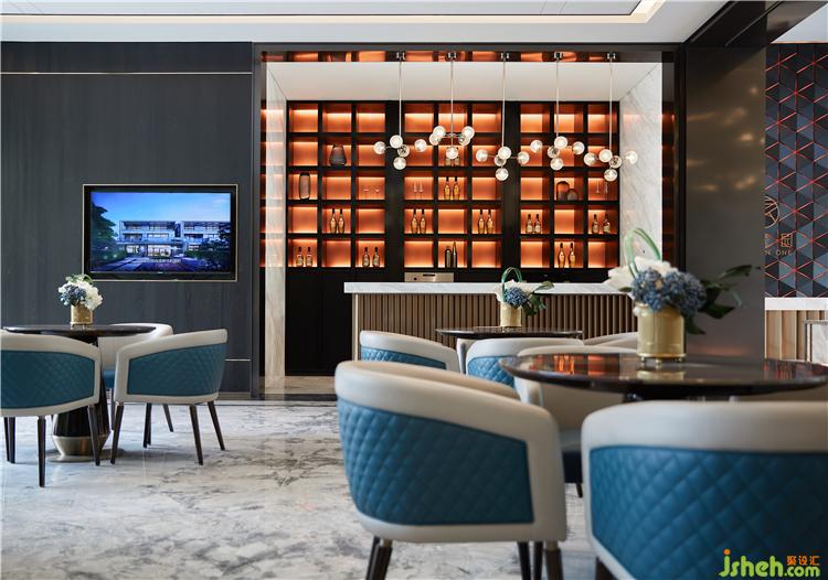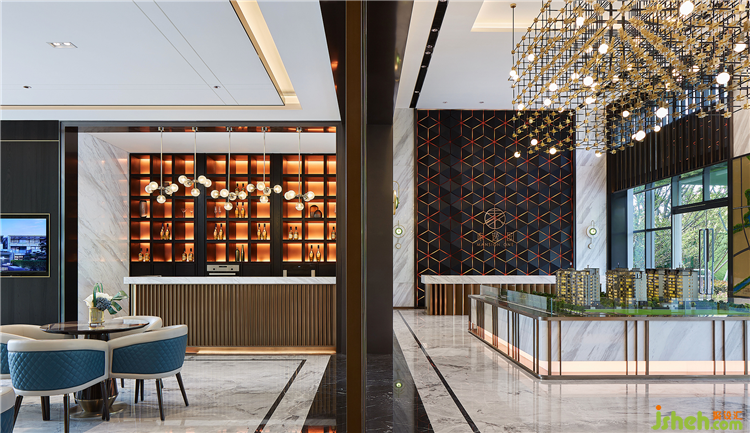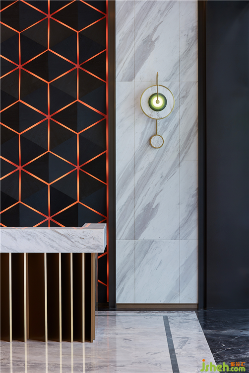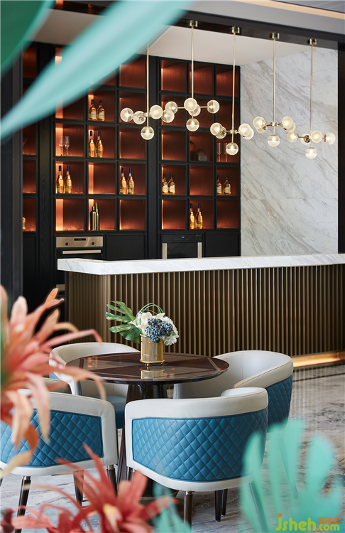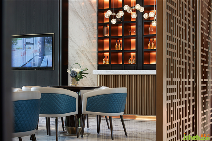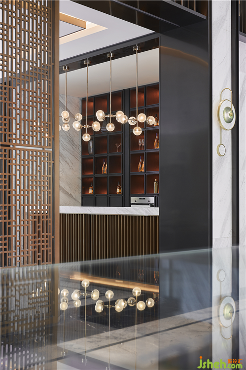 用自由与变化去呼应水的灵动气韵,而Art Deco的精神性则被交托于“融合与对比”:大理石与黄铜,黑钢与黑色木饰面,现代冷傲与复古精致两种截然不同的材质搭配、对比,展现一种包容性极强的融合之美。