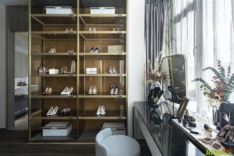 衣帽间时尚线条感随处可见,极具港式风情的香槟金色,烘托出空间的质感内涵,缤纷的时尚饰品增加空间的优雅观感,营造出具有艺术情怀的空间。