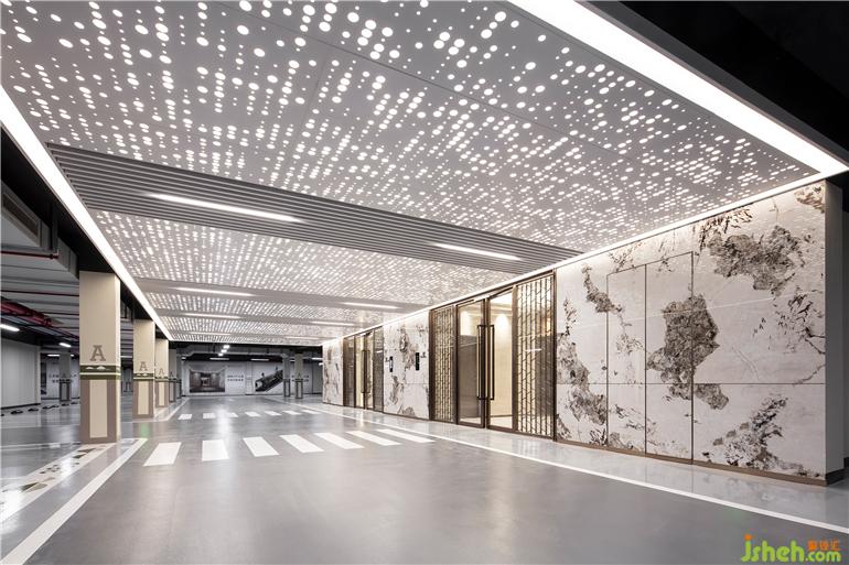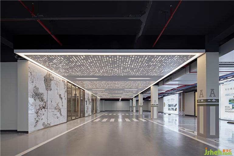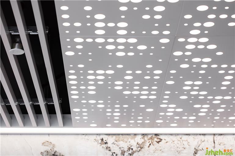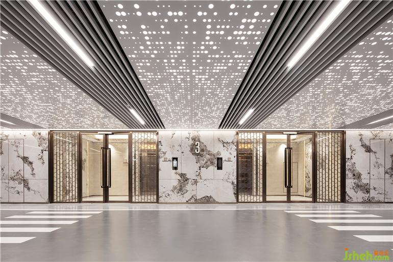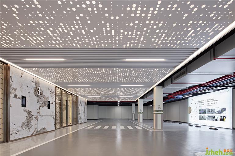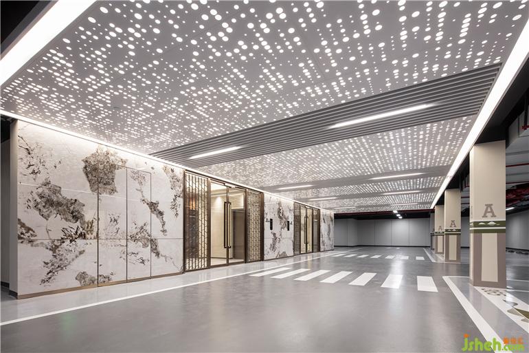 依托海洋文化,车马厅的墙面和天花以冲孔板作为主要装饰材料,与白色铝格栅的组合使空间更具丰富的层次感,汕头停车场设计让住户的归家体验如酒店般奢享品质感。瓷质薄板墙面延续着白、灰的色调,低调又奢华,在波光粼粼的天花板衬印下,宛如响着一曲浪花拍打礁石的协奏曲。
