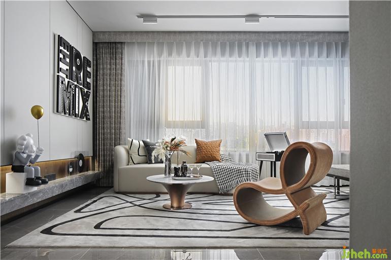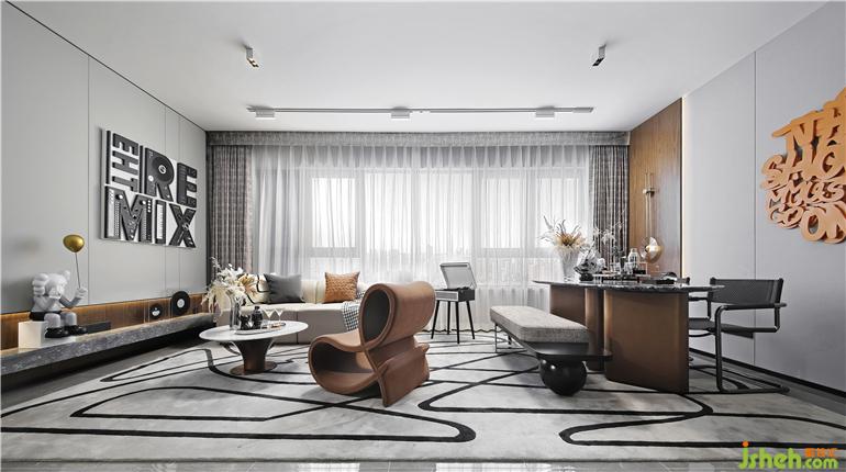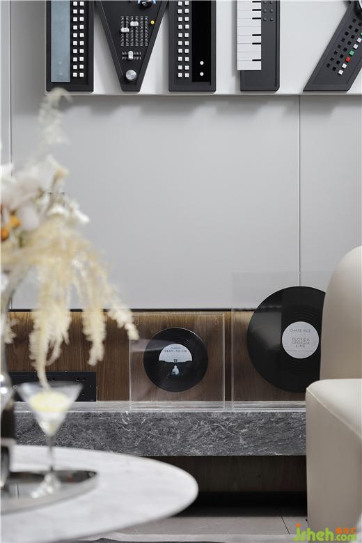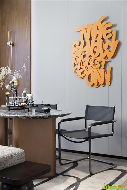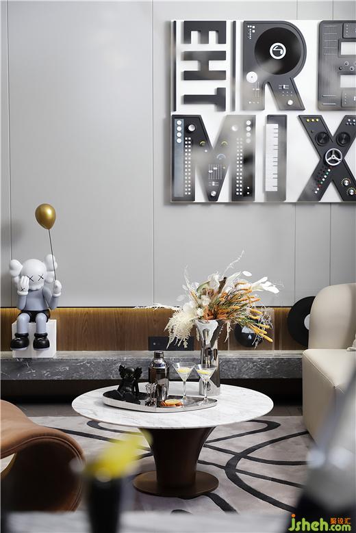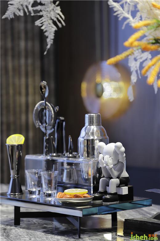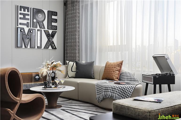 墙壁的炫酷挂画,唱片机的爵士音乐,茶几的卡牌、酒具、龙舌兰,重庆样板间设计卧坐在长沙发或躺椅上,尝一口龙舌兰,甘甜后的微醺空间中。