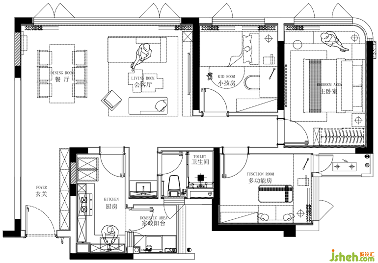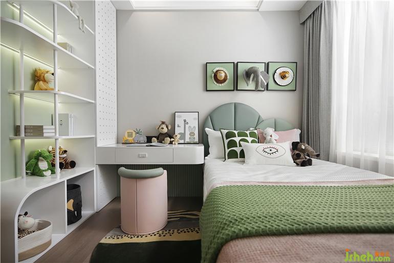 儿童房以浅绿色作为主体孩子的玩具沿着置物架布置,勾勒出童真童趣又颇具未来感的空间氛围。